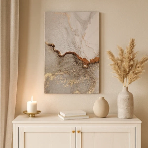 - Dieser elegante Leinwanddruck im Format 70 x 50 cm zeigt ein abstraktes Motiv in Gold- und Grautönen. Perfekt für moderne Innenräume, verleiht er jedem Raum eine luxuriöse Note.