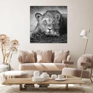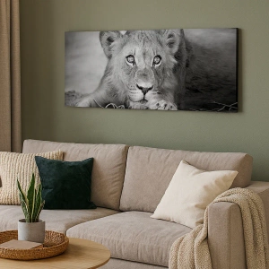 Bild auf Leinwand - Leinwandbild - Monochromes Porträt eines liegenden jungen Löwen - 120x80cm - Königlicher Welpe - Moderne Wanddekoration für Wohnzimmer und Schlafzimmer ARTTOR