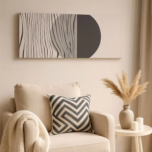 Halbe Komposition ist ein Leinwandgemälde, das die Eleganz von Linien und die Präzision der Geometrie in einem minimalistischen Stil vereint. Die wellenförmige Linienkomposition wird durch geometrische Formen ergänzt, wodurch ein harmonisches Ganzes in gedämpften Farben entsteht. Das Gemälde beeindruckt durch seine Schlichtheit und seinen universellen Charakter, perfekt für moderne Innenräume.