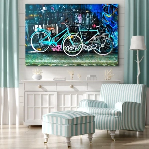 Bild auf Leinwand - Leinwandbild - Zwei türkisfarbene Fahrräder vor einer urbanen Graffiti-Kulisse. - 120x80cm - Die Stadt ruft - Moderne Wanddekoration für Wohnzimmer und Schlafzimmer ARTTOR