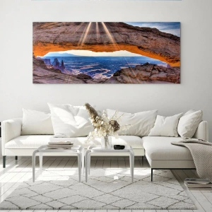 Glasbild - Bild auf glas - Felsbogen mit Sonnenstrahlen vor dem Landschaftshintergrund - 50x70cm - Durch das Felsentor - Moderne Wanddekoration für Wohnzimmer und Schlafzimmer ARTTOR