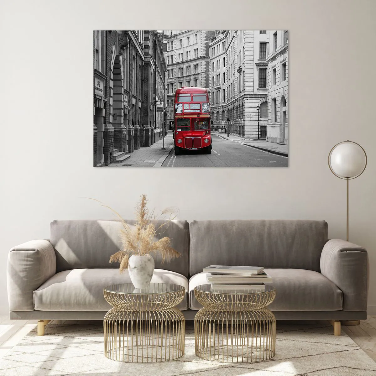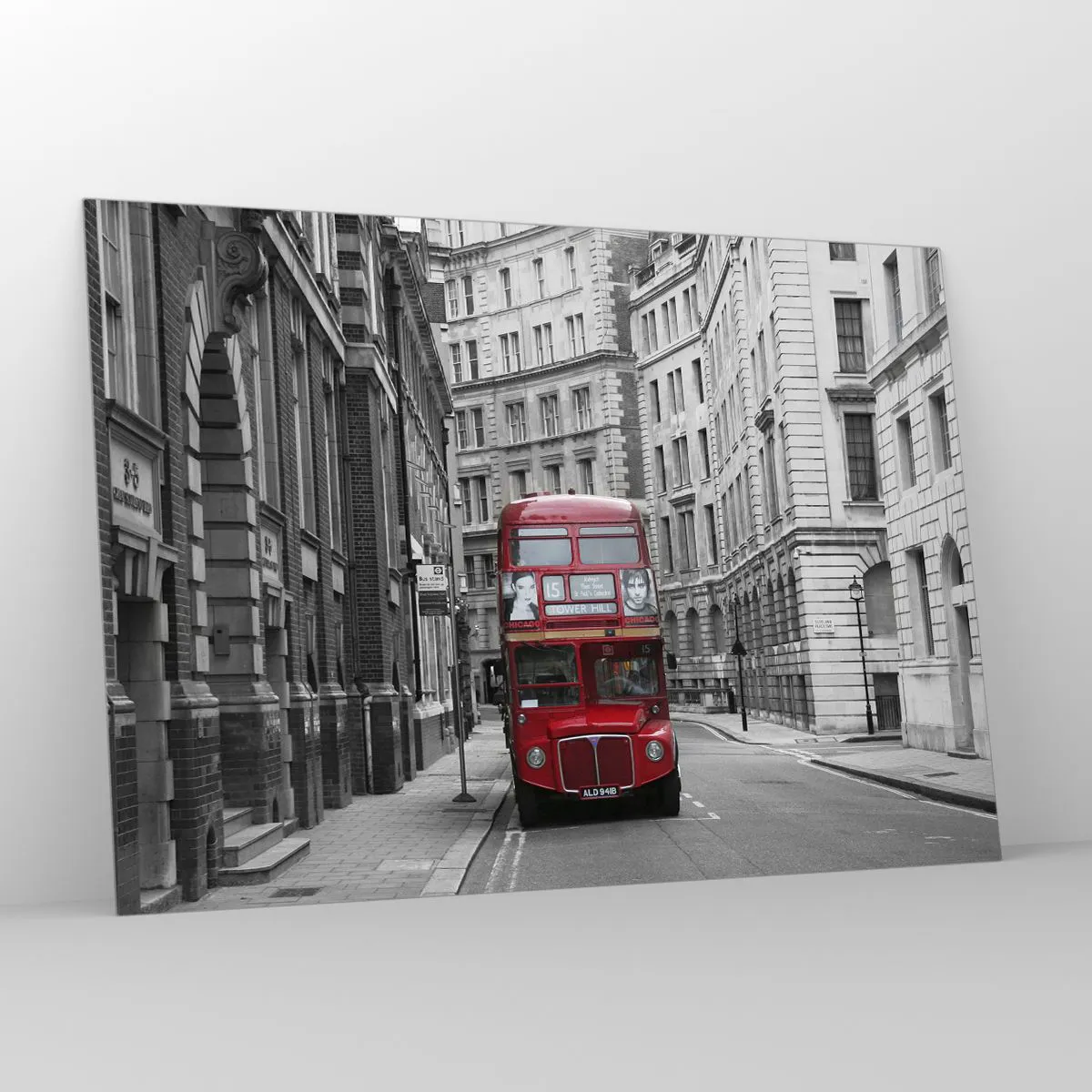 Glasbild - Bild auf glas - Ein roter Bus durch die einfarbigen Straßen der Stadt - 100x70cm - Der Alltag muss nicht grau sein - Moderne Wanddekoration für Wohnzimmer und Schlafzimmer ARTTOR