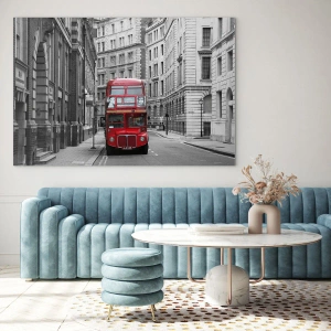 Glasbild - Bild auf glas - Ein roter Bus durch die einfarbigen Straßen der Stadt - 120x80cm - Der Alltag muss nicht grau sein - Moderne Wanddekoration für Wohnzimmer und Schlafzimmer ARTTOR