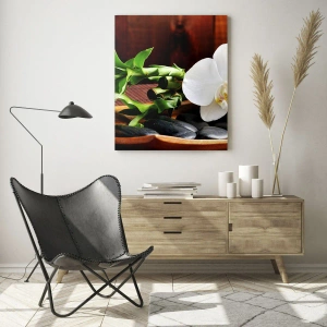 Glasbild - Bild auf glas - Weiße Orchidee mit Bambus vor einem Steinhintergrund im Zen-Stil - 80x120cm - Geben Sie sich dem Hauch der Natur hin - Moderne Wanddekoration für Wohnzimmer und Schlafzimmer ARTTOR