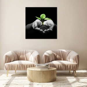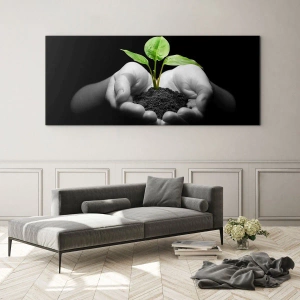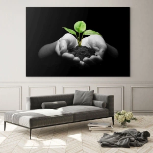 Glasbild - Bild auf glas - Hände halten eine grüne Pflanze auf schwarzem Hintergrund - 160x50cm - Ich liebe die Natur, ich beschütze sie - Moderne Wanddekoration für Wohnzimmer und Schlafzimmer ARTTOR
