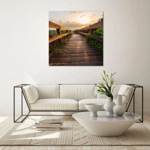 Glasbild - Bild auf glas - Holzsteg zum Strand bei Sonnenuntergang - 100x70cm - Und direkt ans Ufer - Moderne Wanddekoration für Wohnzimmer und Schlafzimmer ARTTOR