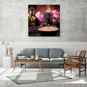 Glasbild - Bild auf glas - Entspannungskomposition mit Buddha, Kerzen und Blumen - 50x70cm - Den Geist frei machen, den Körper beruhigen - Moderne Wanddekoration für Wohnzimmer und Schlafzimmer ARTTOR