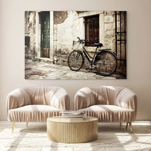 Glasbild - Bild auf glas - Ein schwarz-weißes Fahrrad lehnt an einem alten Mietshaus - 50x70cm - Zurück in die Vergangenheit - Moderne Wanddekoration für Wohnzimmer und Schlafzimmer ARTTOR