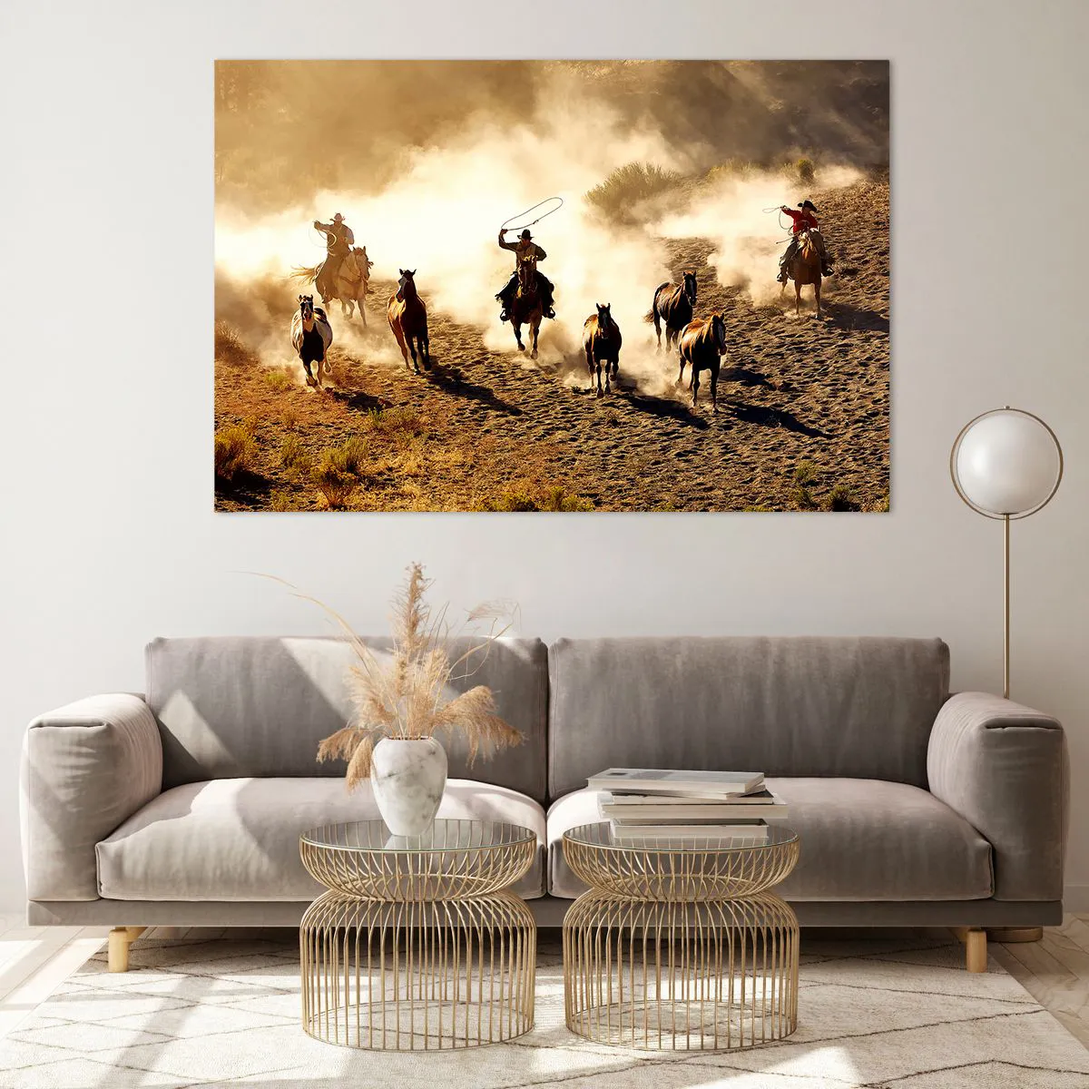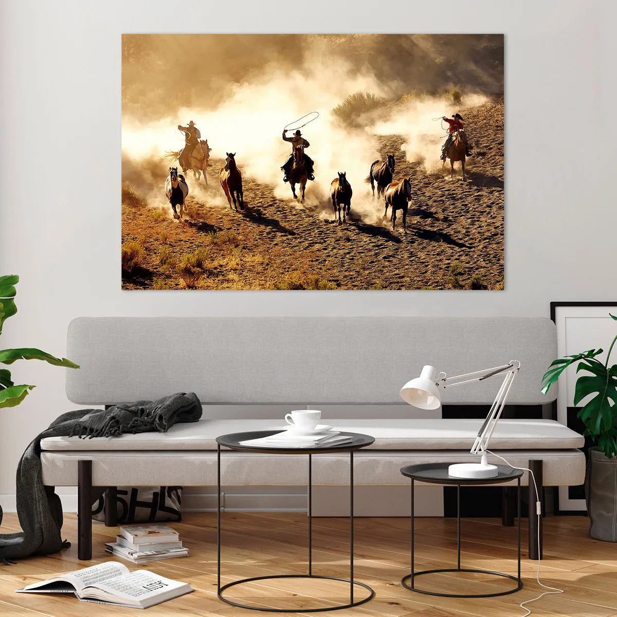 Glasbild - Bild auf glas - Cowboys zu Pferd im Staub bei einem Rodeo - 120x80cm - Wirklich wilder Westen - Moderne Wanddekoration für Wohnzimmer und Schlafzimmer ARTTOR