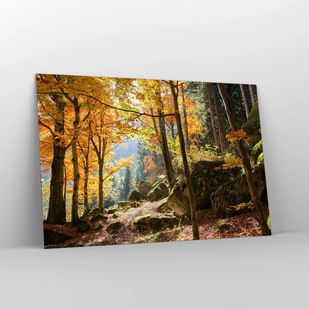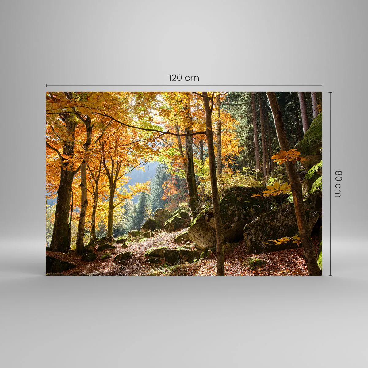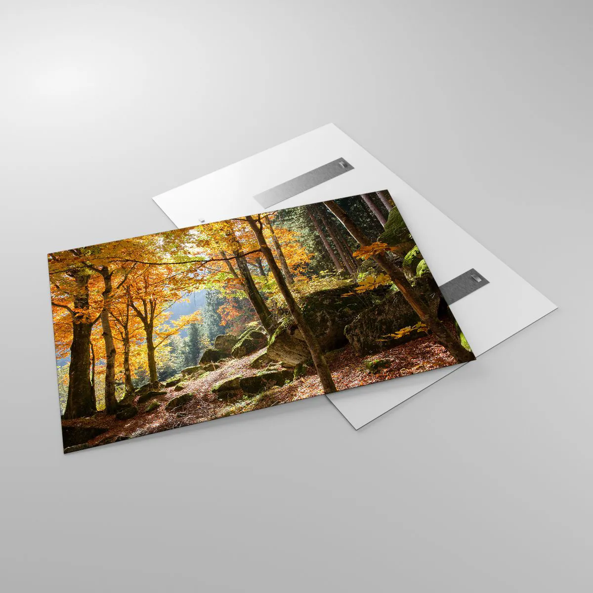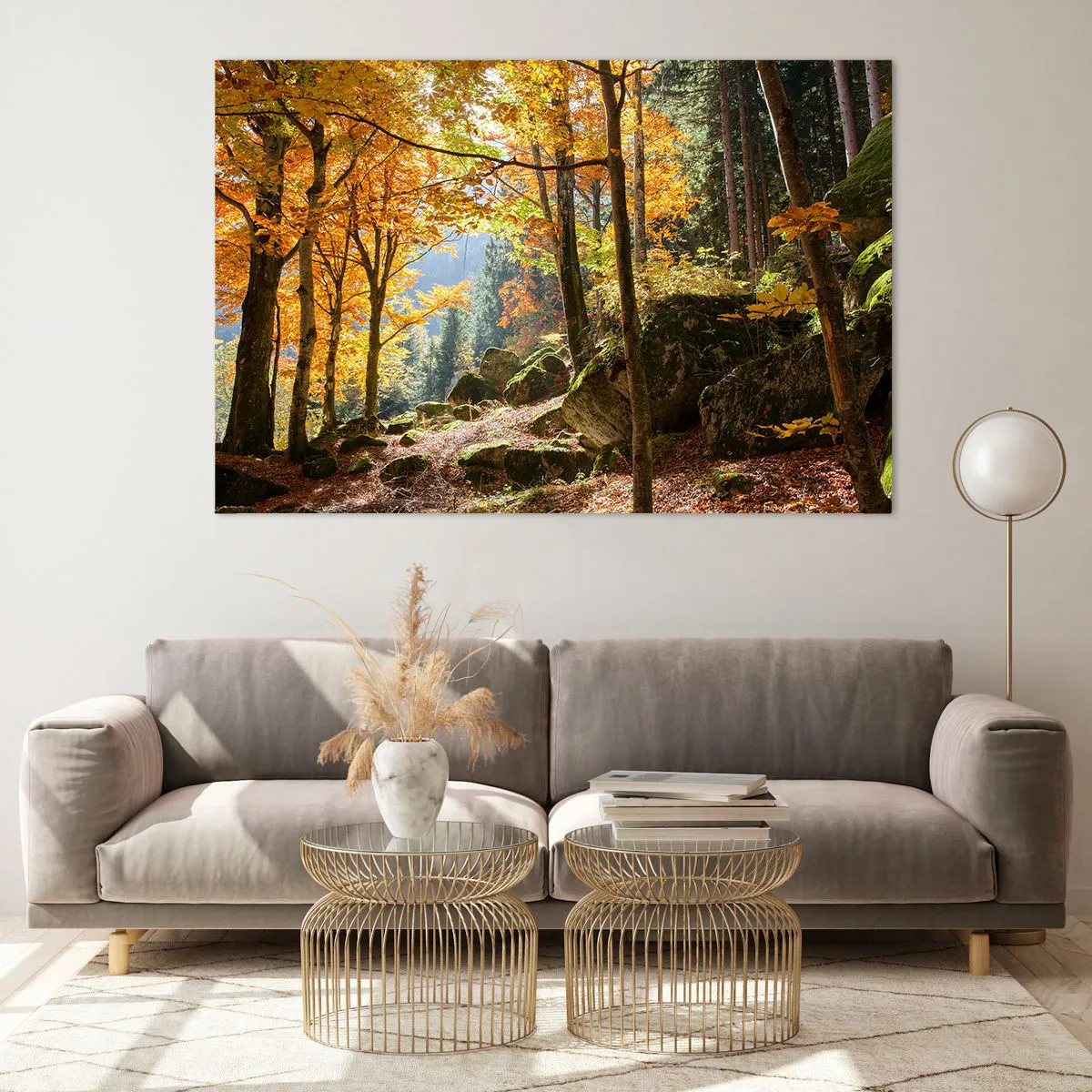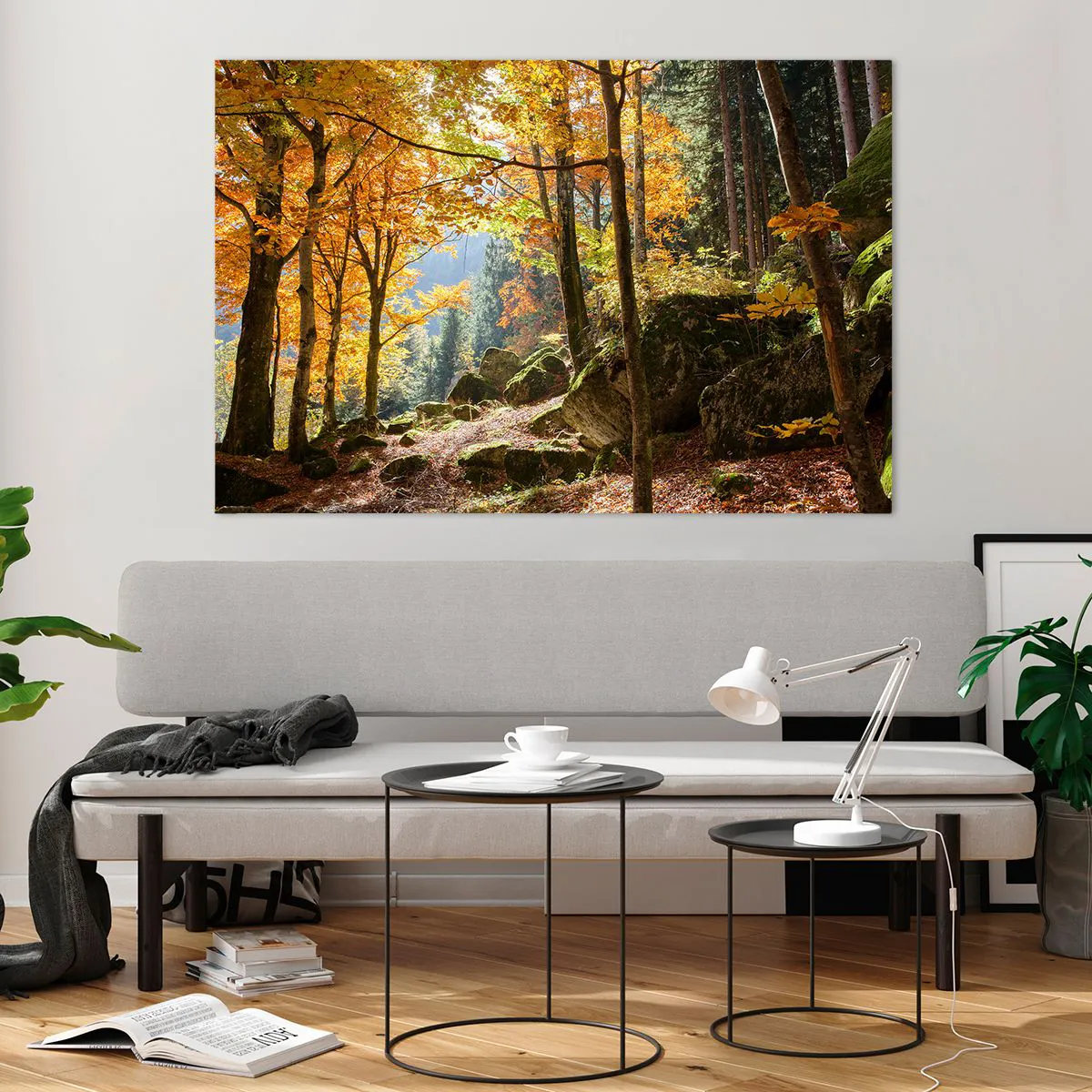 Glasbild - Bild auf glas - Herbstwald mit Sonnenstrahlen und Steinen - 120x80cm - Zeit zum Entspannen - Moderne Wanddekoration für Wohnzimmer und Schlafzimmer ARTTOR