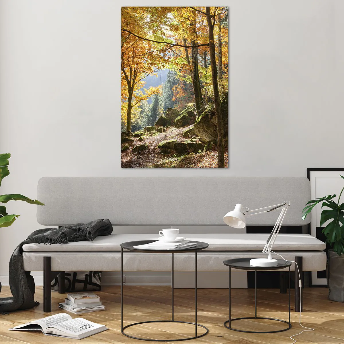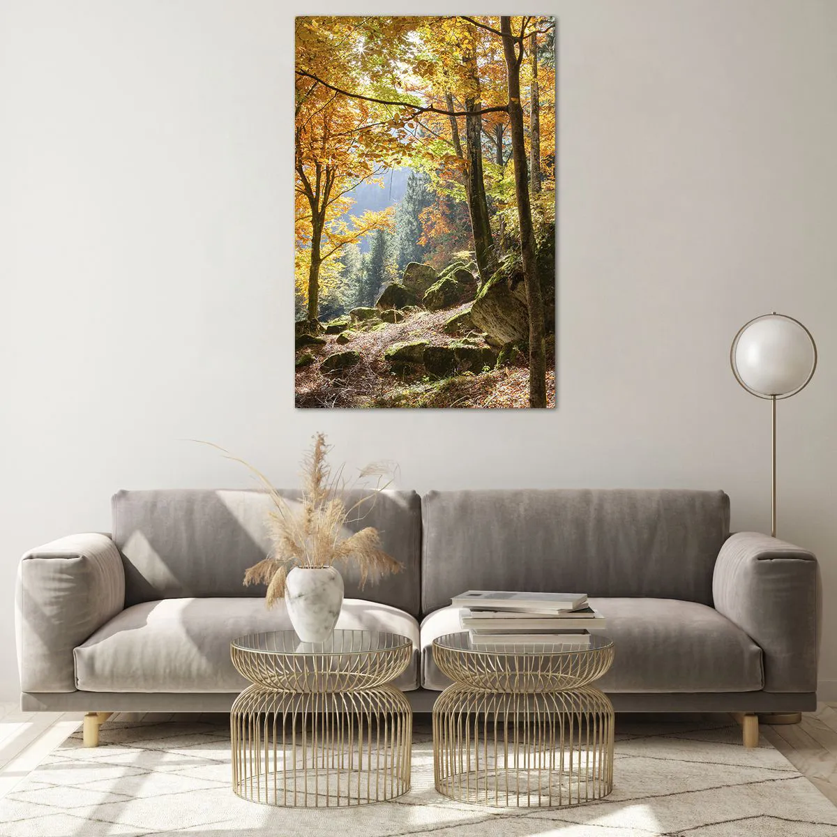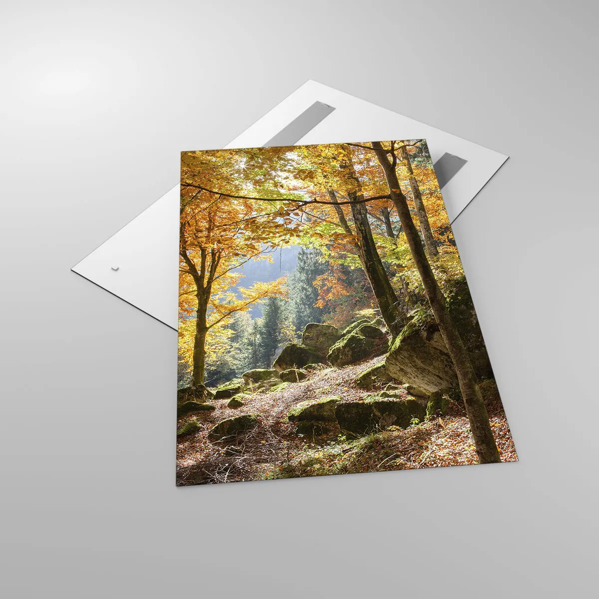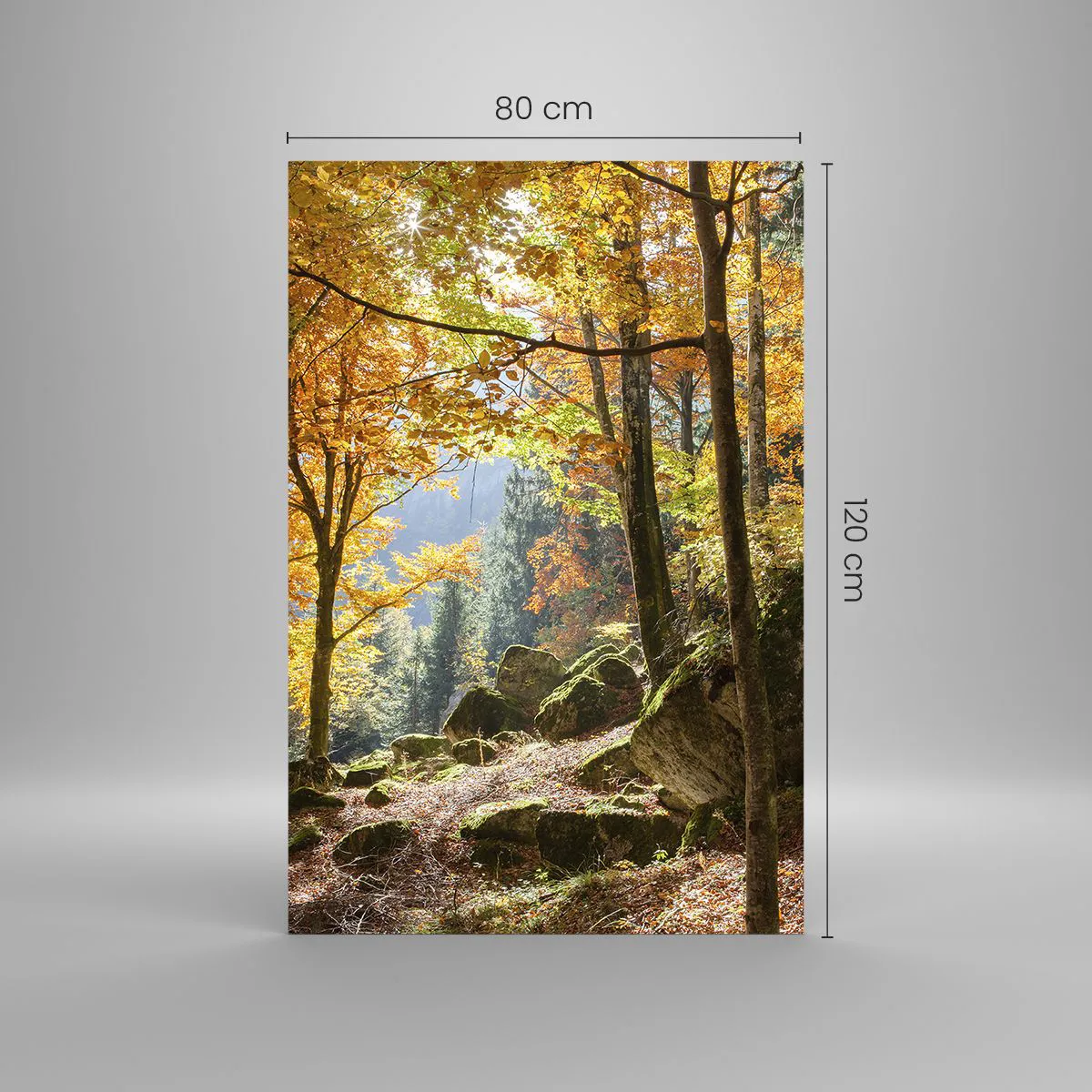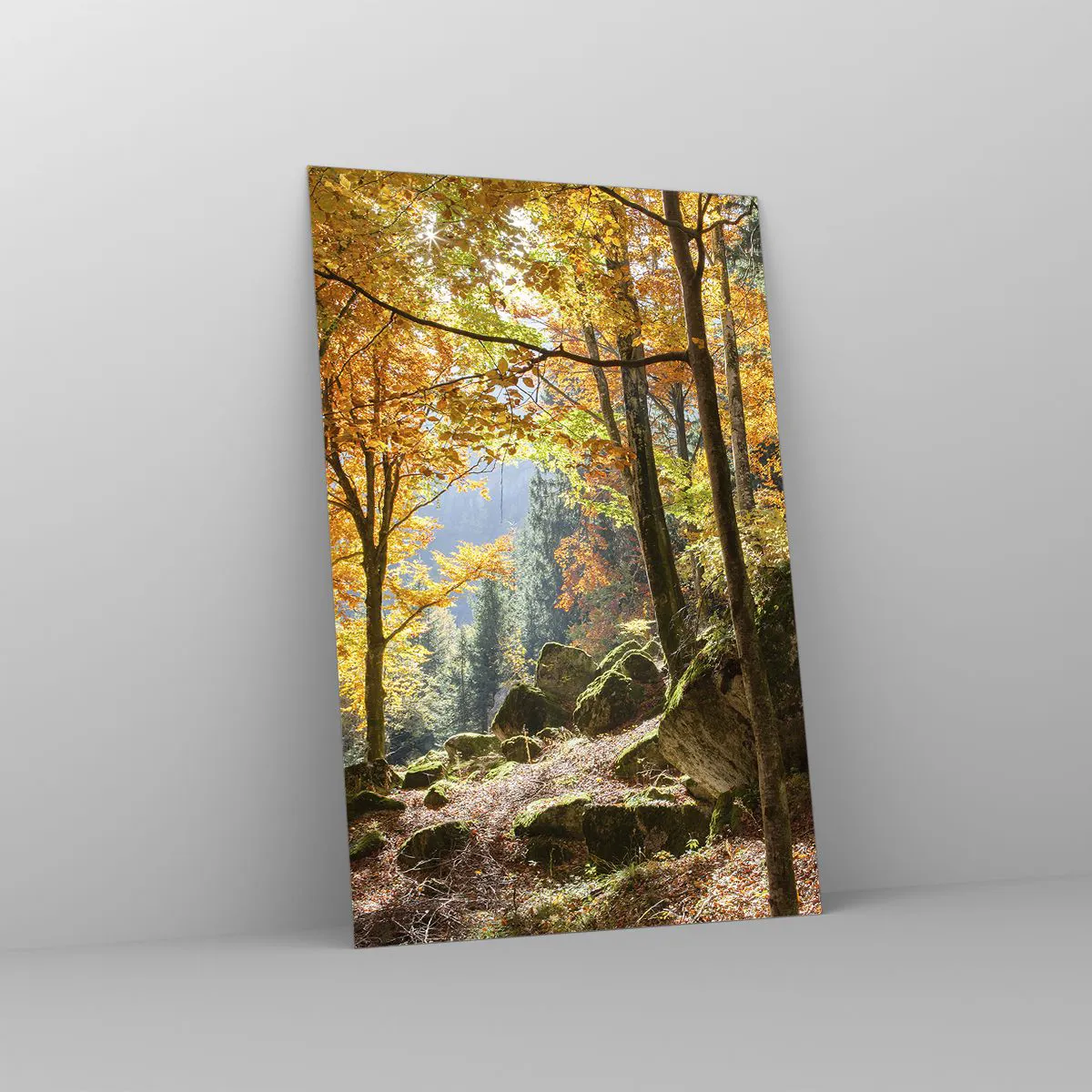 Glasbild - Bild auf glas - Ein Herbstwald voller goldener Blätter und Sonnenlicht - 80x120cm - Zeit zum Entspannen - Moderne Wanddekoration für Wohnzimmer und Schlafzimmer ARTTOR