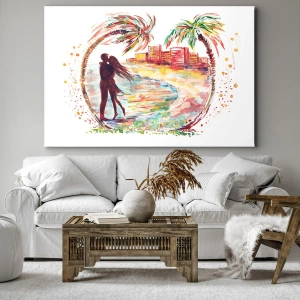 Bild auf Leinwand - Leinwandbild - Romantische Paarszene an einem Strand mit Palmen in Aquarell - 70x50cm - Romantischer Urlaub - Moderne Wanddekoration für Wohnzimmer und Schlafzimmer ARTTOR