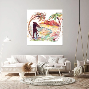 Die romantische Strandszene mit Palmen ist die perfekte Wahl für alle, die Kunst, tropische Landschaften und Motive rund um Liebe und Entspannung schätzen. Das Gemälde kann auch ein inspirierendes Geschenk für einen geliebten Menschen oder eine Ergänzung für ein sommerliches Interieur sein.