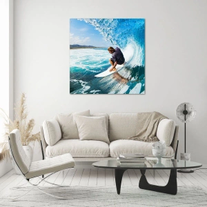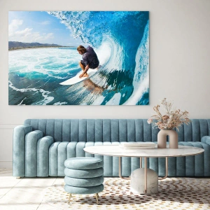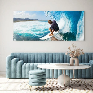 Glasbild - Bild auf glas - Surfer in einem Wassertunnel mit dem Ozean im Hintergrund - 70x50cm - Tanzen mit den Wellen - Moderne Wanddekoration für Wohnzimmer und Schlafzimmer ARTTOR