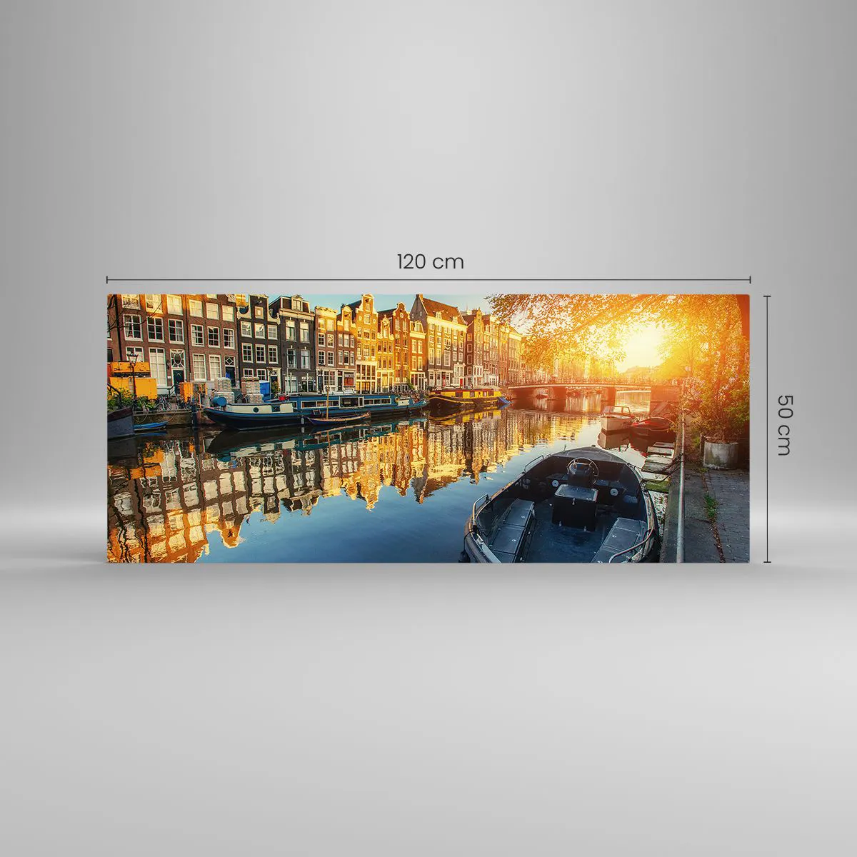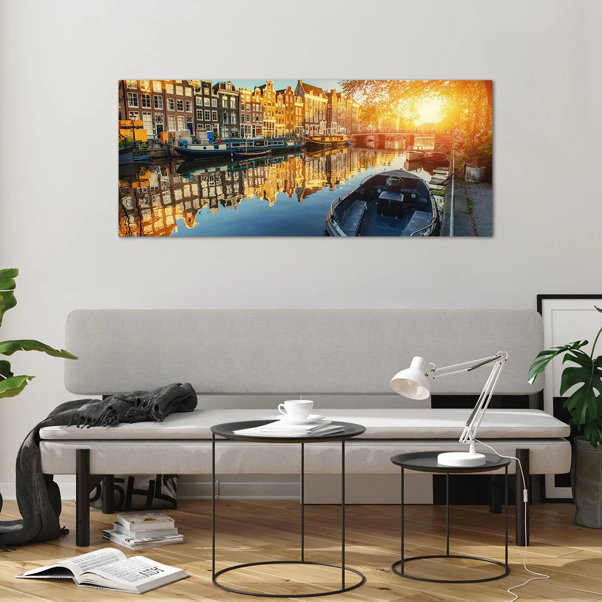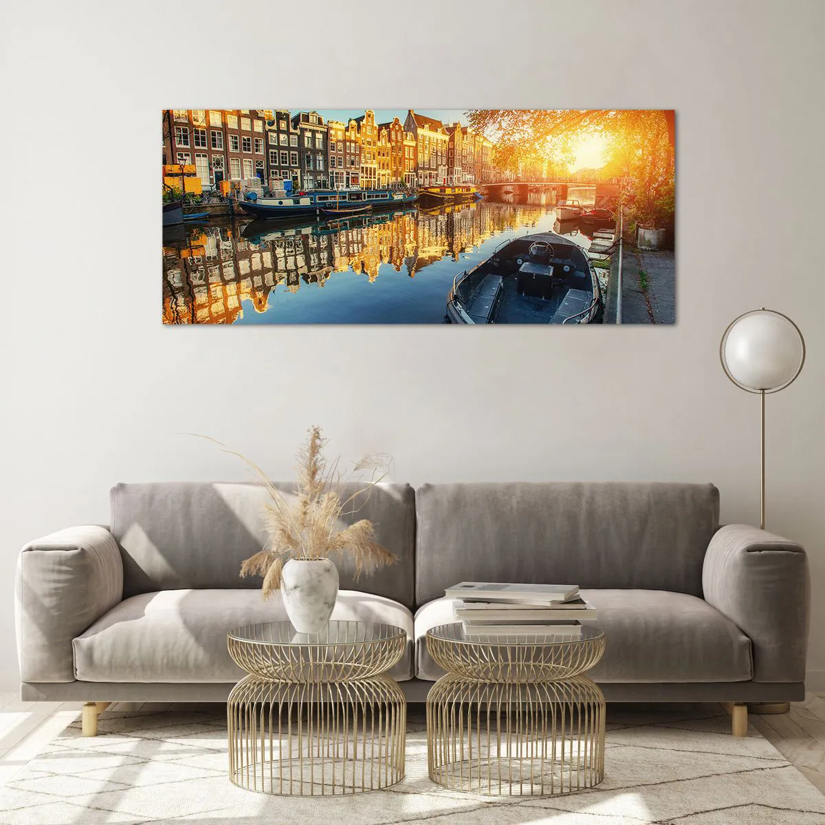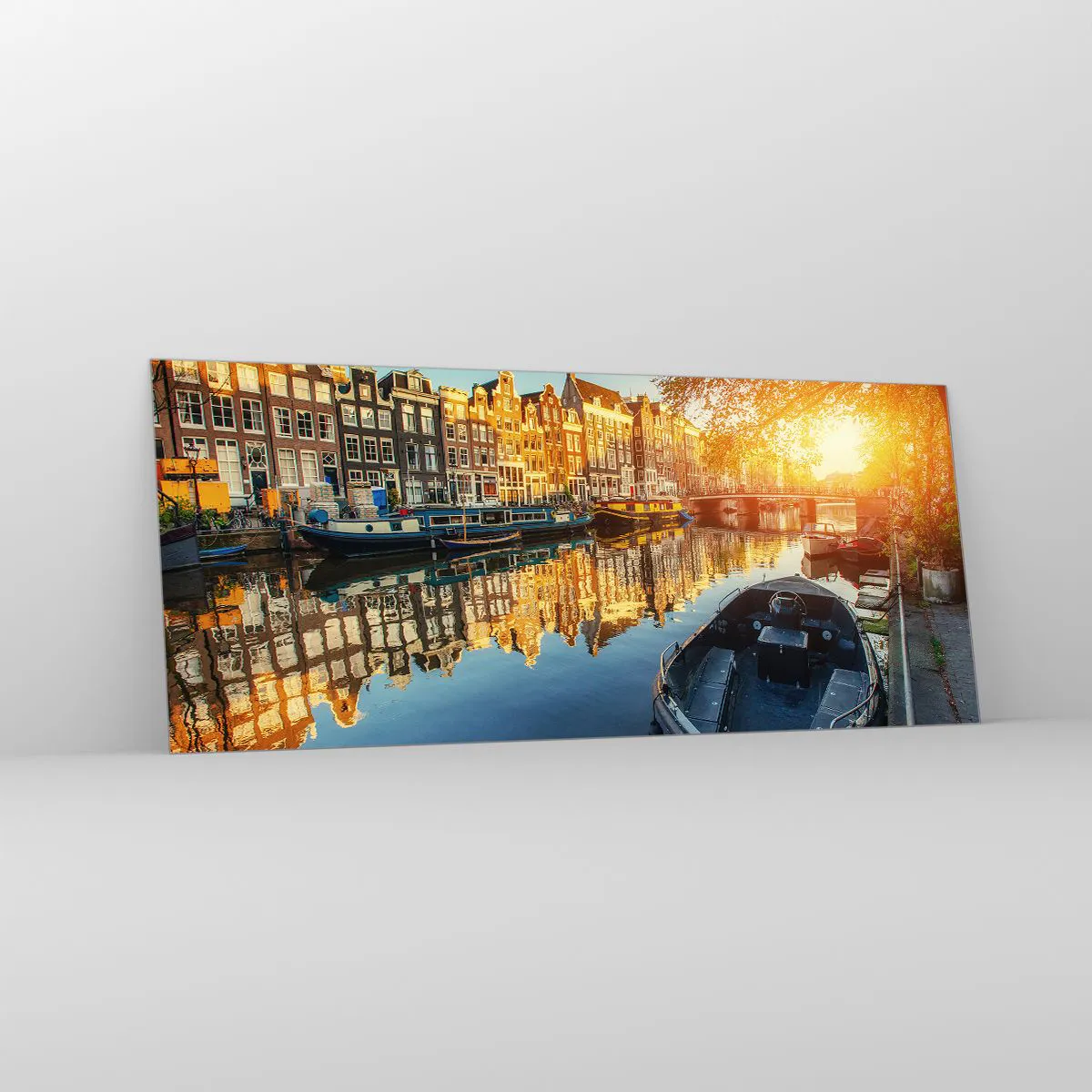 Glasbild - Bild auf glas - Amsterdamer Kanal bei Sonnenuntergang - 120x50cm - Morgen in Amsterdam - Moderne Wanddekoration für Wohnzimmer und Schlafzimmer ARTTOR