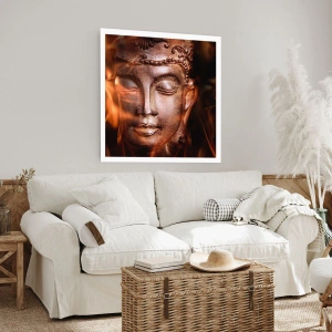 Poster - Buddha-Skulptur leuchtet in warmem Licht - 50x70cm - Es existiert nur hier und jetzt - Moderne Wanddekoration für Wohnzimmer und Schlafzimmer ARTTOR
