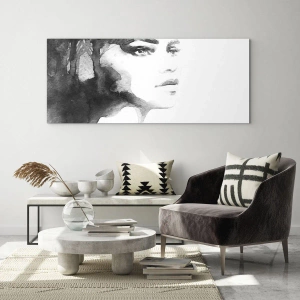 Glasbild - Bild auf glas - Ein subtiles Porträt einer Frau in Schwarz-Weiß-Tönen - 80x120cm - Aus Geheimnis und Nebel - Moderne Wanddekoration für Wohnzimmer und Schlafzimmer ARTTOR