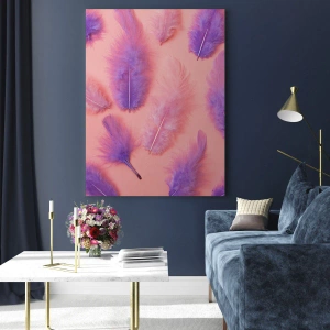 Wandbild – Lila Vogel der Sehnsucht – Lila Federn auf rosa Hintergrund in einer zarten Komposition