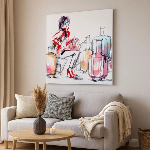 Bild auf Leinwand - Leinwandbild - Eine Frau mit Koffern in einer dynamischen Aquarellillustration - 100x70cm - Setzen wir uns vor der Reise hin - Moderne Wanddekoration für Wohnzimmer und Schlafzimmer ARTTOR