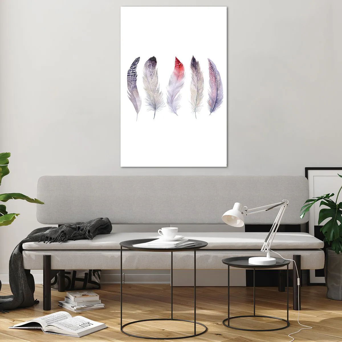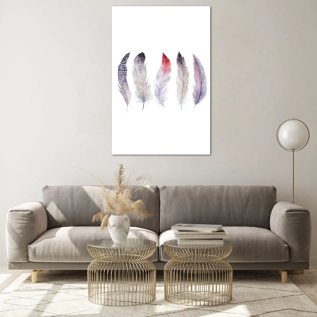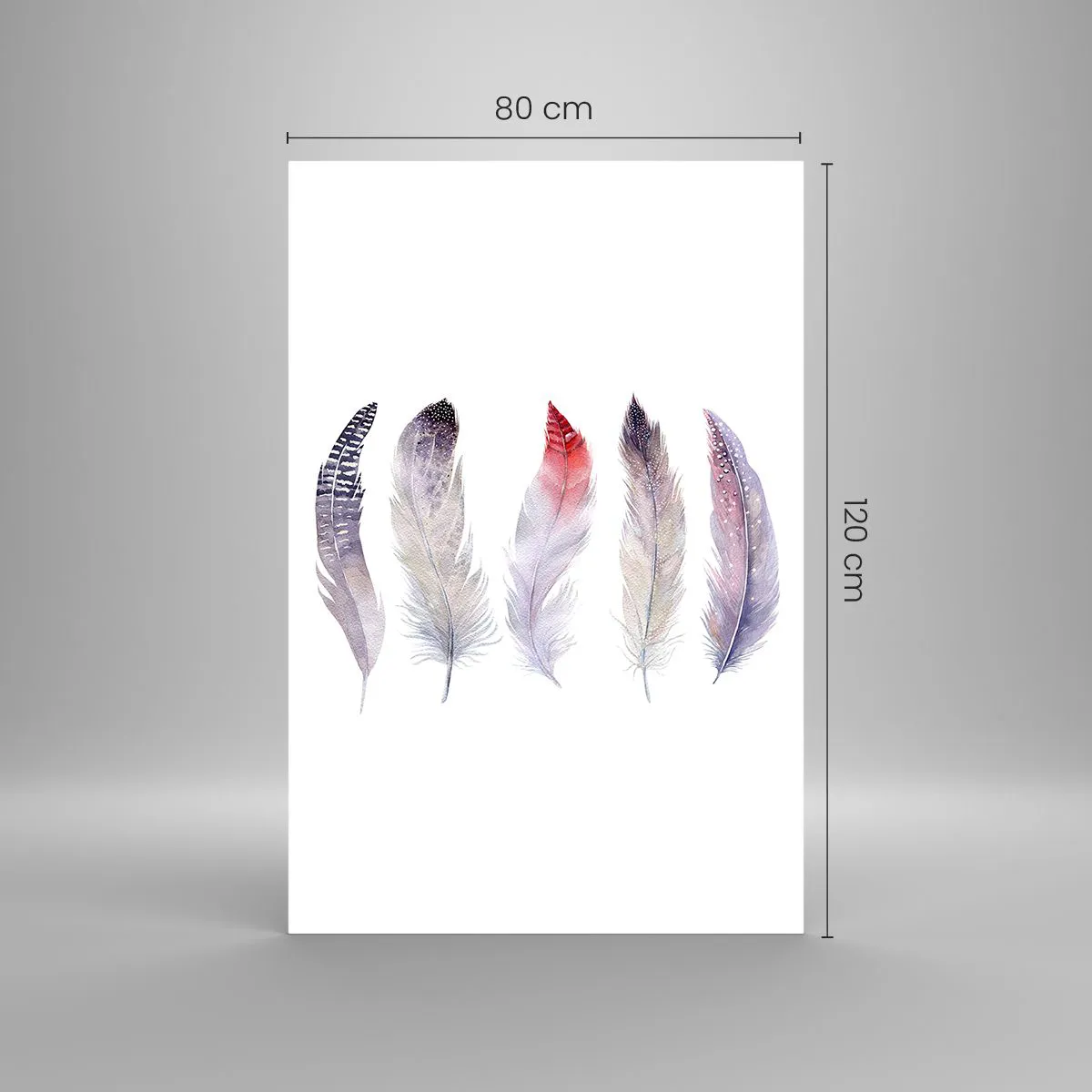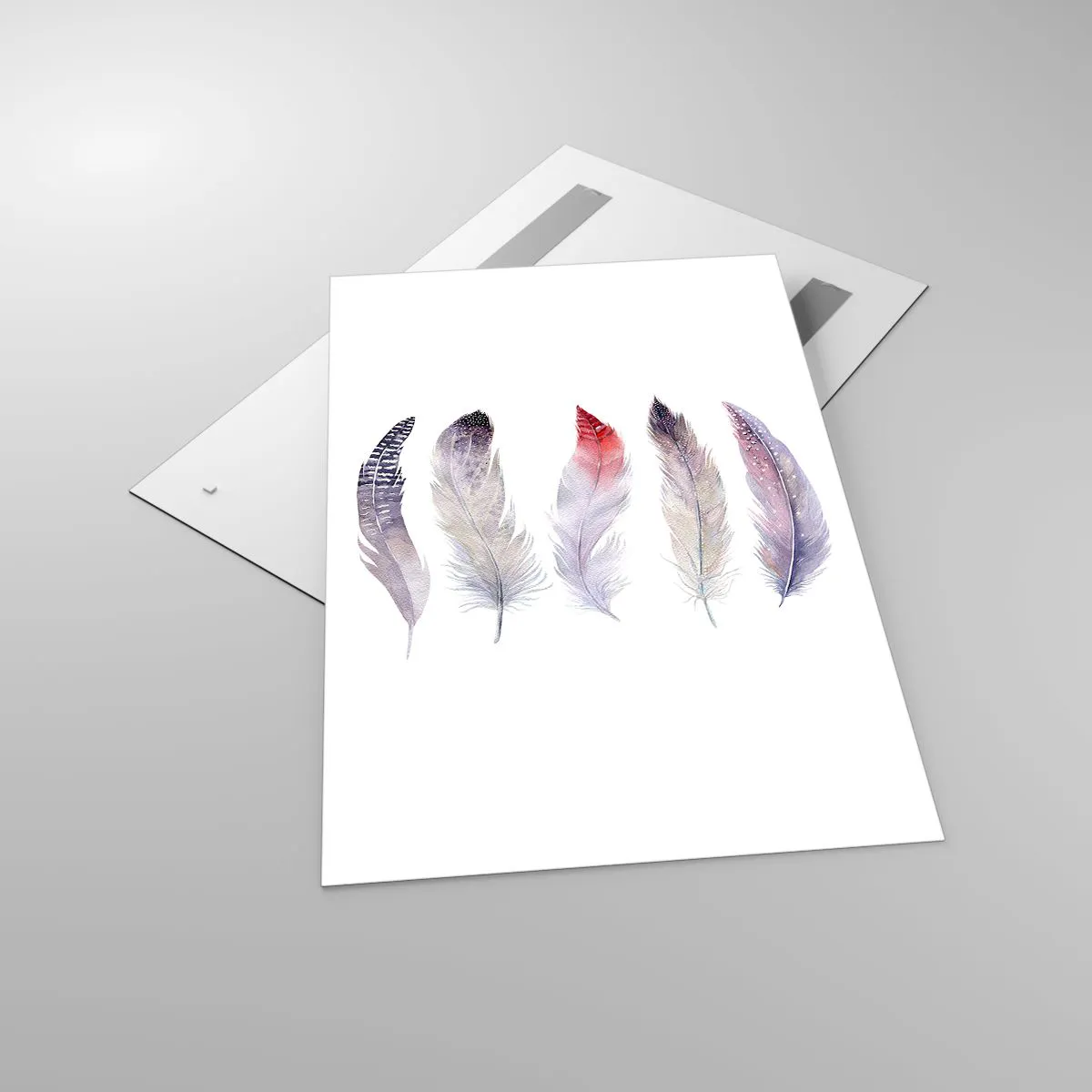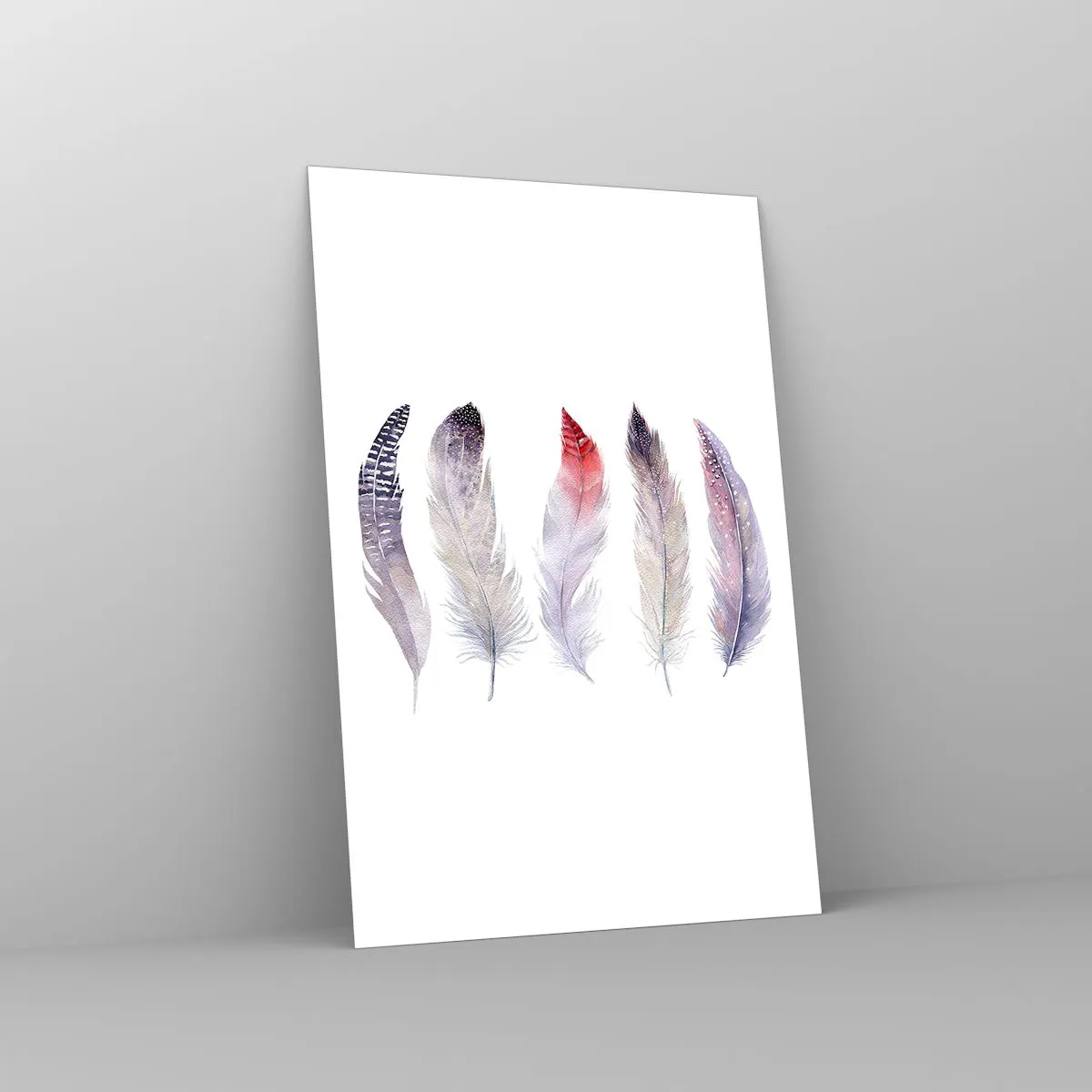 Glasbild - Bild auf glas - Fünf zarte Federn in Pastelltönen auf hellem Untergrund - 80x120cm - Zart wie mehrfarbiger Nebel - Moderne Wanddekoration für Wohnzimmer und Schlafzimmer ARTTOR