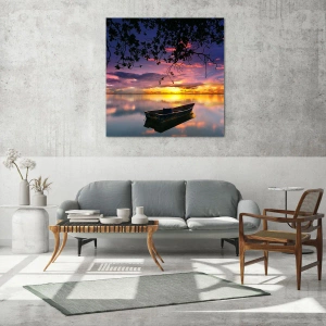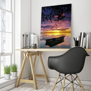 Glasbild - Bild auf glas - Ein Boot auf ruhigem Wasser bei Sonnenuntergang - 80x120cm - Du scheinst mitten am Himmel zu hängen... - Moderne Wanddekoration für Wohnzimmer und Schlafzimmer ARTTOR