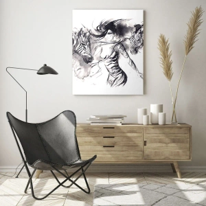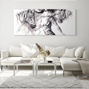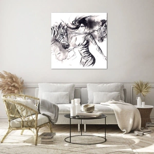 Glasbild - Bild auf glas - Eine Frau in einem dynamischen Tanz mit Zebras in einer Schwarz-Weiß-Ästhetik - 80x120cm - Tanzen mit den Zebras - Moderne Wanddekoration für Wohnzimmer und Schlafzimmer ARTTOR