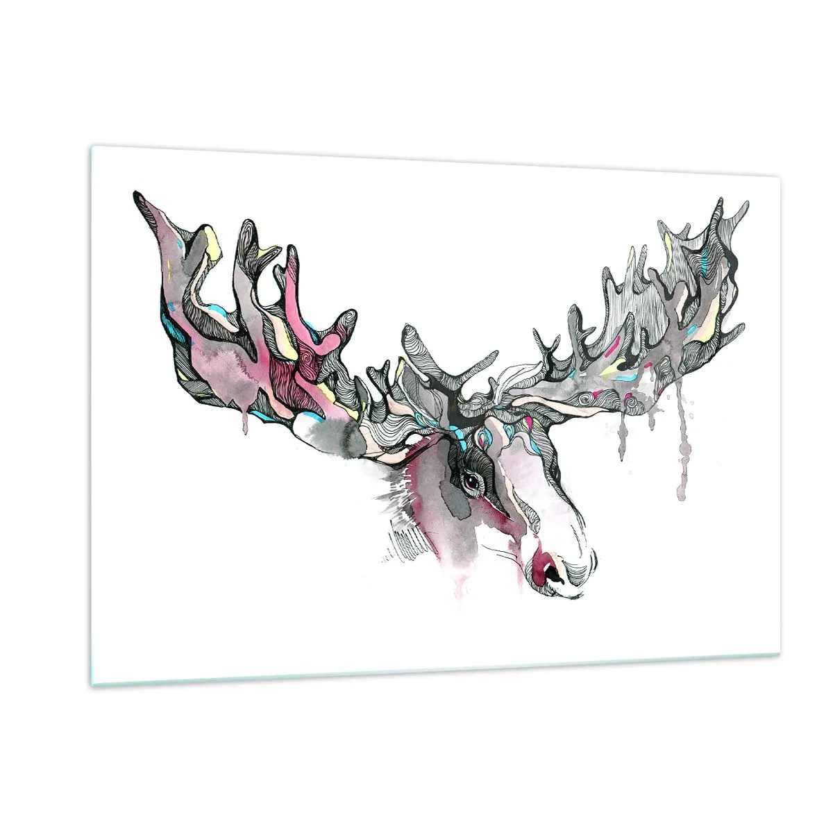 Glasbild - Bild auf glas - Buntes Aquarell eines Elches mit ausgedehntem Geweih - 120x80cm - Krone des Waldkönigs - Moderne Wanddekoration für Wohnzimmer und Schlafzimmer ARTTOR