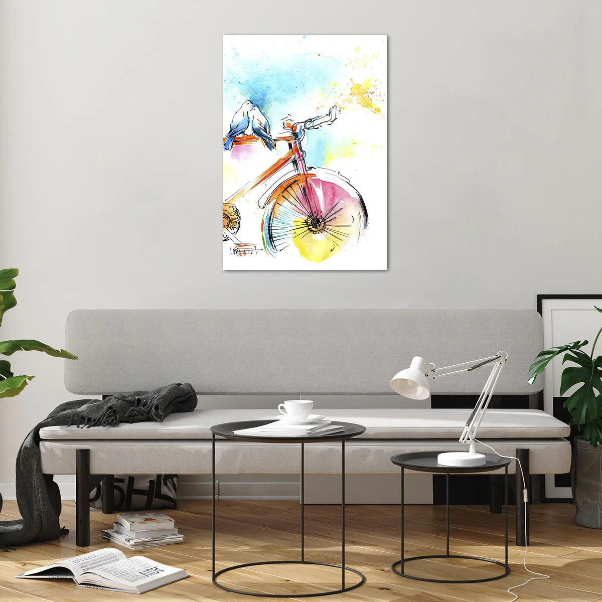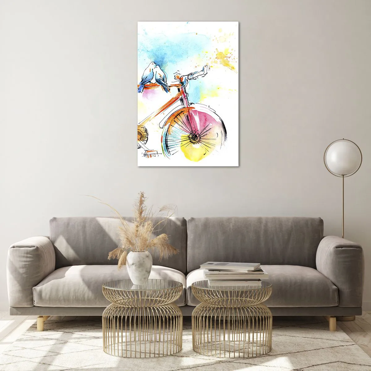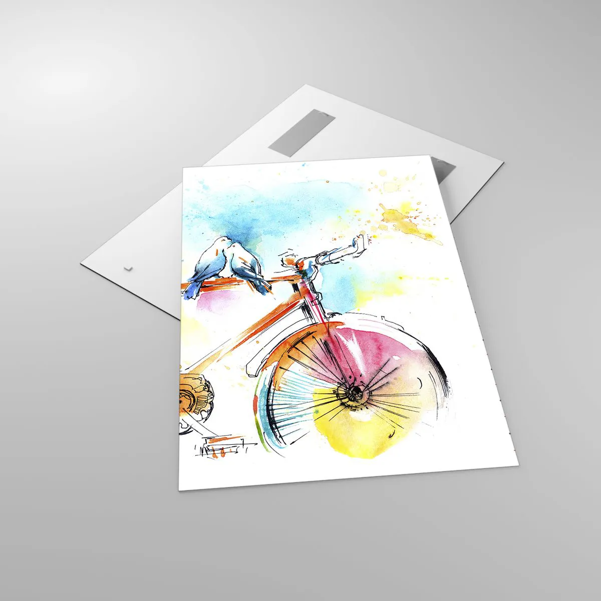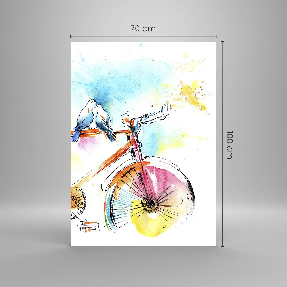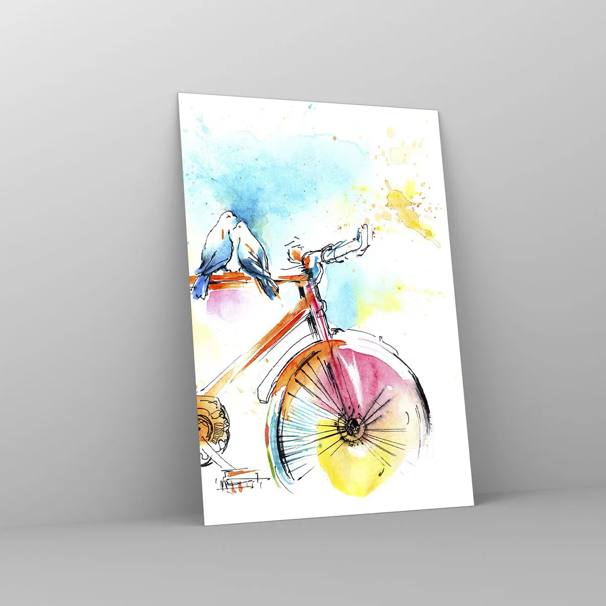 Glasbild - Bild auf glas - Buntes Aquarell eines Fahrrads mit darauf sitzenden Vögeln - 70x100cm - Fahrrad für zwei - Moderne Wanddekoration für Wohnzimmer und Schlafzimmer ARTTOR