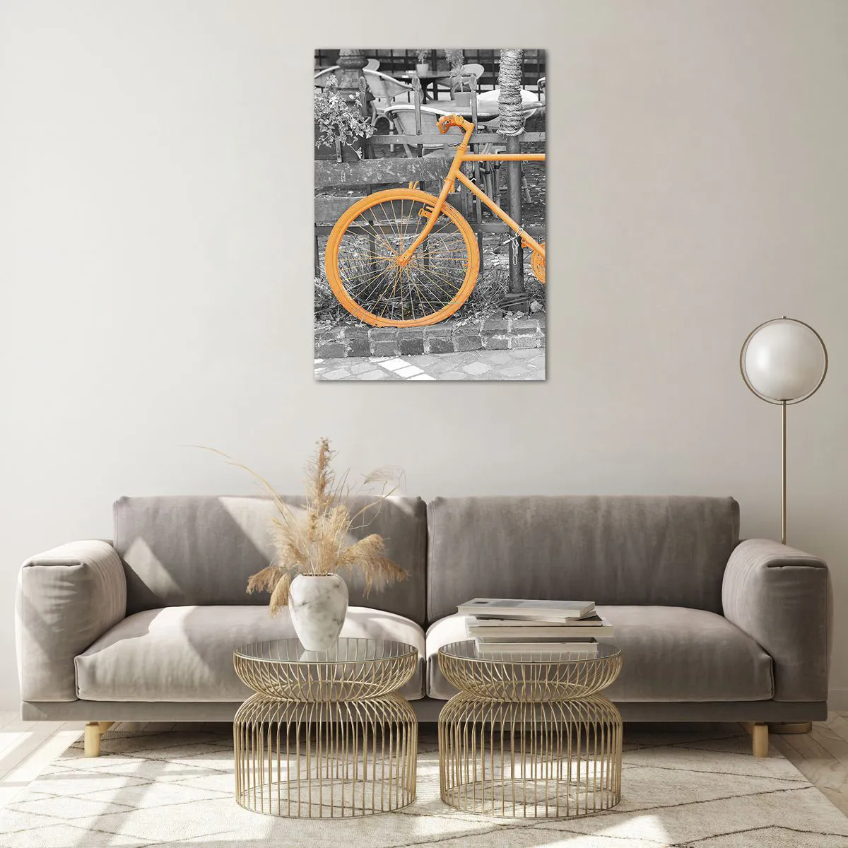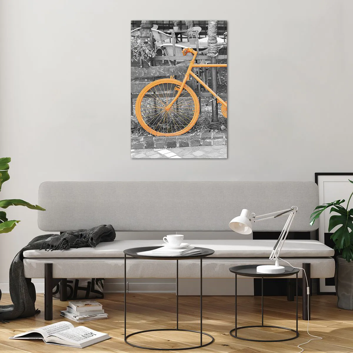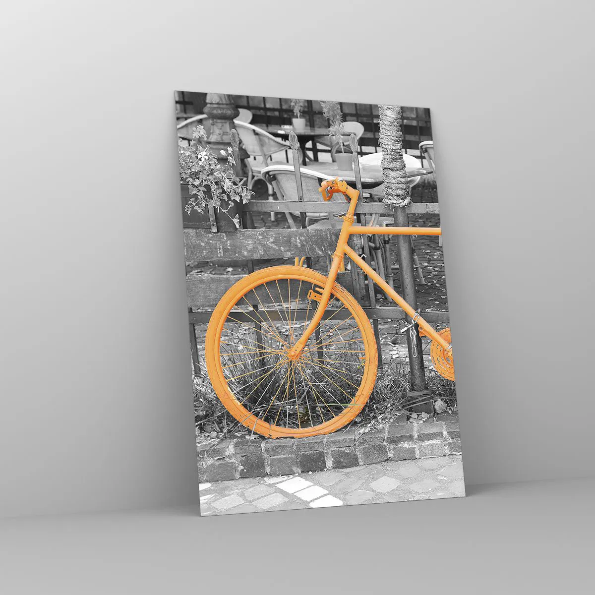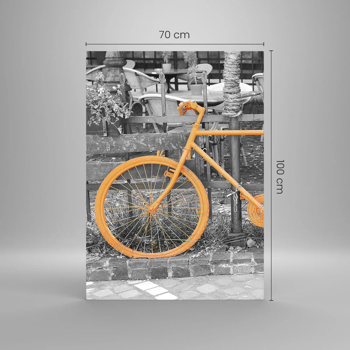 Glasbild - Bild auf glas - Künstlerische Fotografie eines gelben Fahrrads vor einem schwarz-weißen Hintergrund - 70x100cm - Geh, ich warte hier - Moderne Wanddekoration für Wohnzimmer und Schlafzimmer ARTTOR