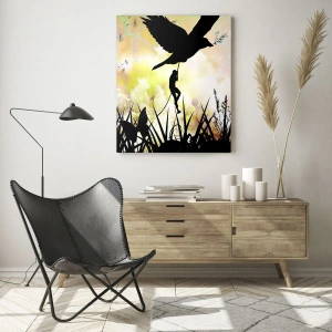 Glasbild - Bild auf glas - Illustration einer Figur, die vor einem Hintergrund aus bunten Blumen auf einen Vogel klettert. - 120x80cm - In märchenhafter Atmosphäre - Moderne Wanddekoration für Wohnzimmer und Schlafzimmer ARTTOR