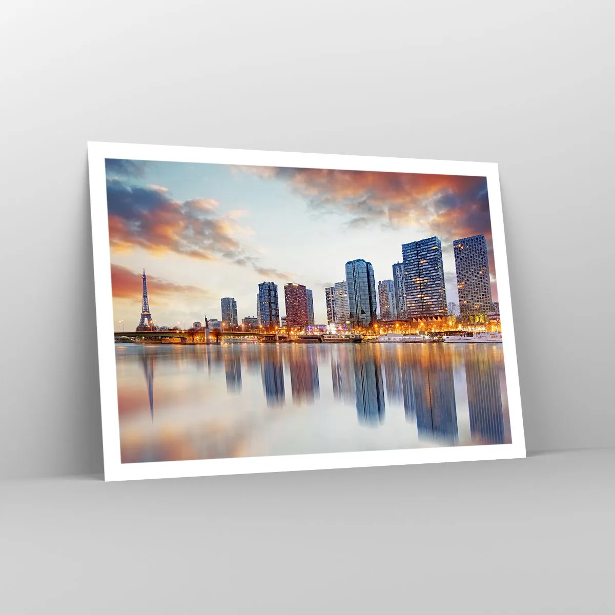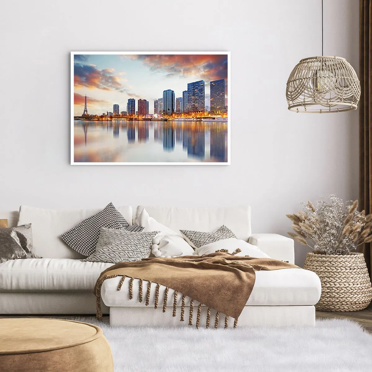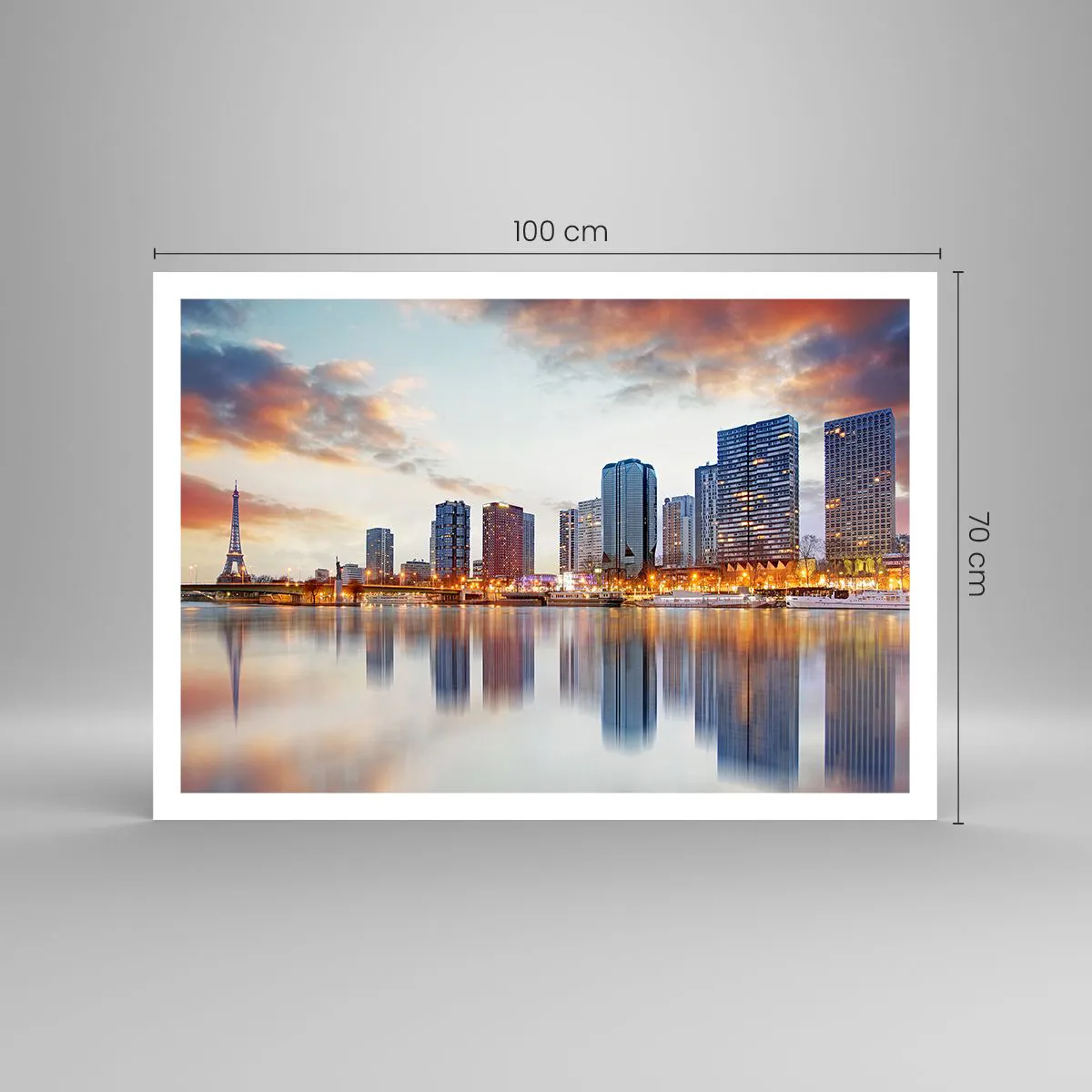 Poster - Panorama moderner Gebäude und des Eiffelturms über dem Wasser - 100x70cm - Die monumentale Ruhe von Paris - Moderne Wanddekoration für Wohnzimmer und Schlafzimmer ARTTOR