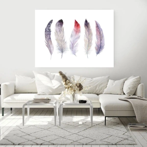 Poster - Fünf zarte Federn in Pastelltönen auf hellem Untergrund - 100x70cm - Zart wie mehrfarbiger Nebel - Moderne Wanddekoration für Wohnzimmer und Schlafzimmer ARTTOR