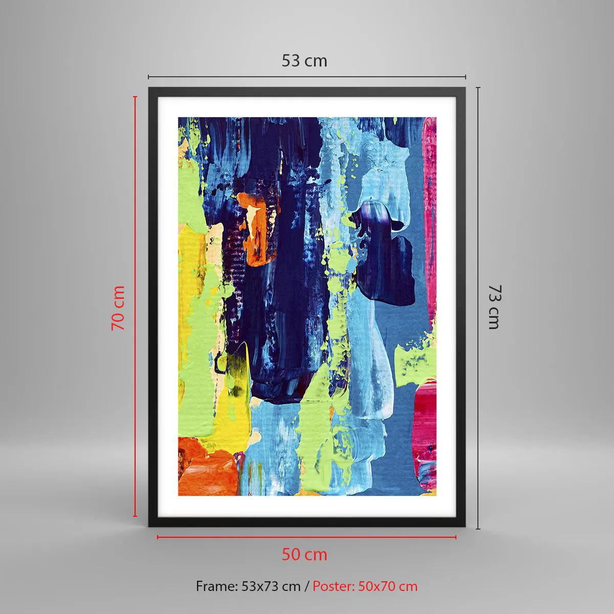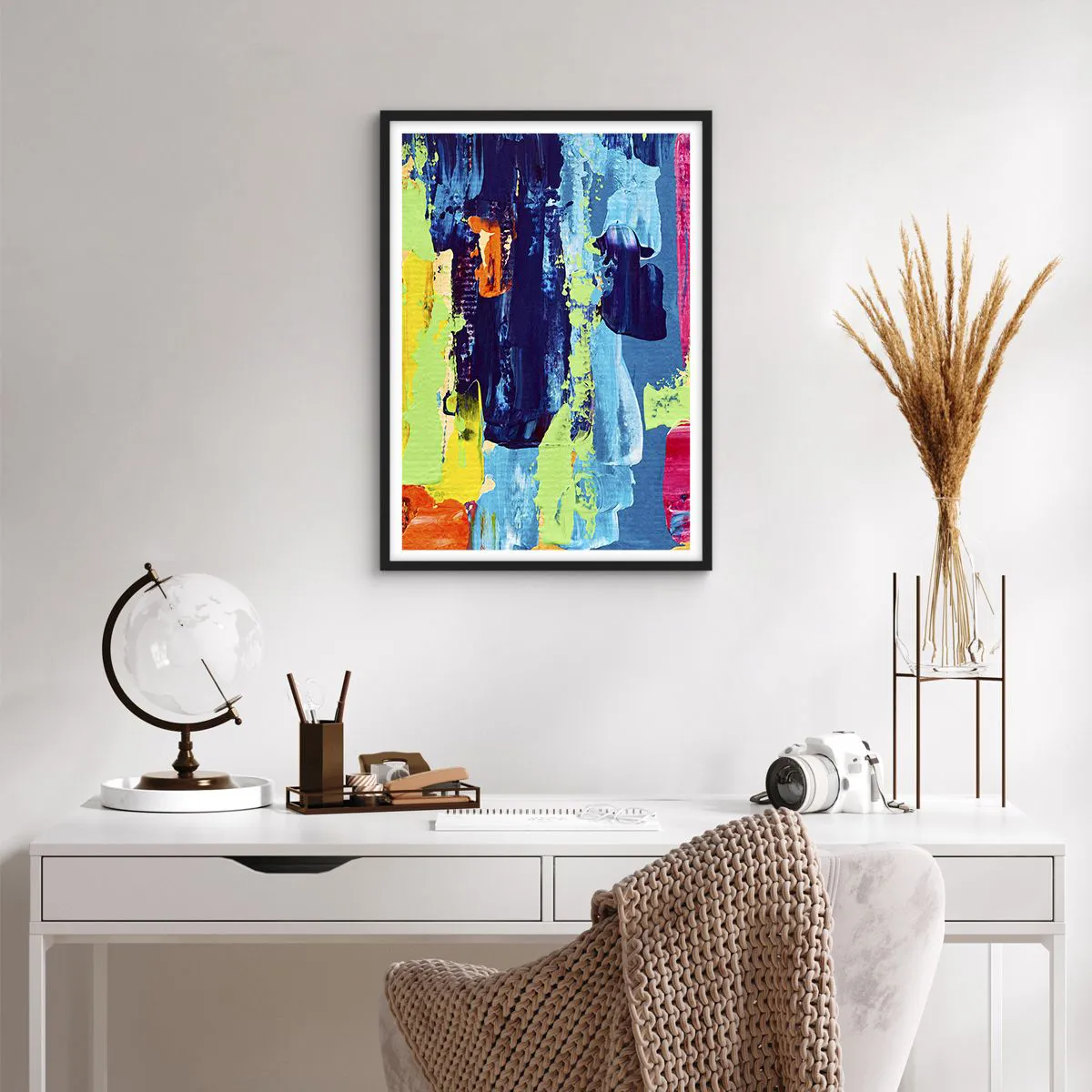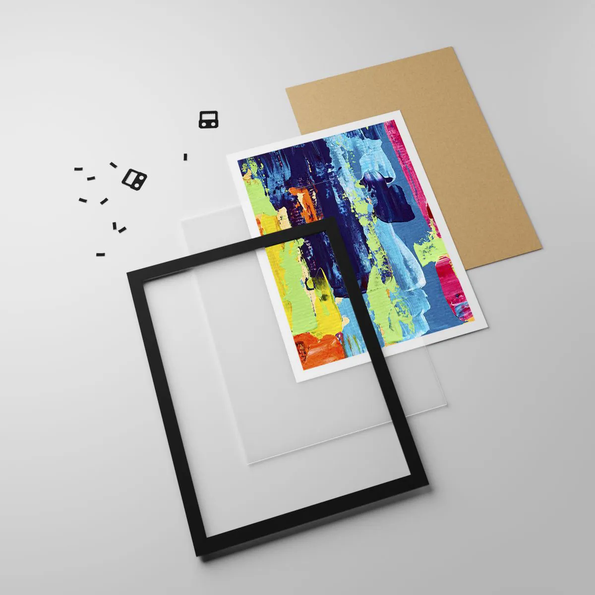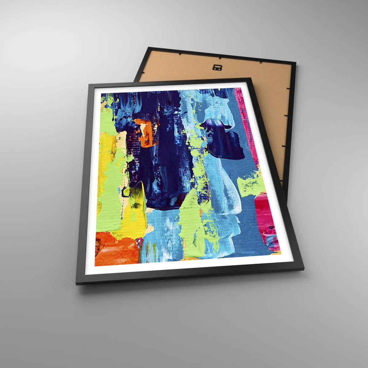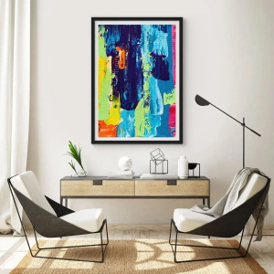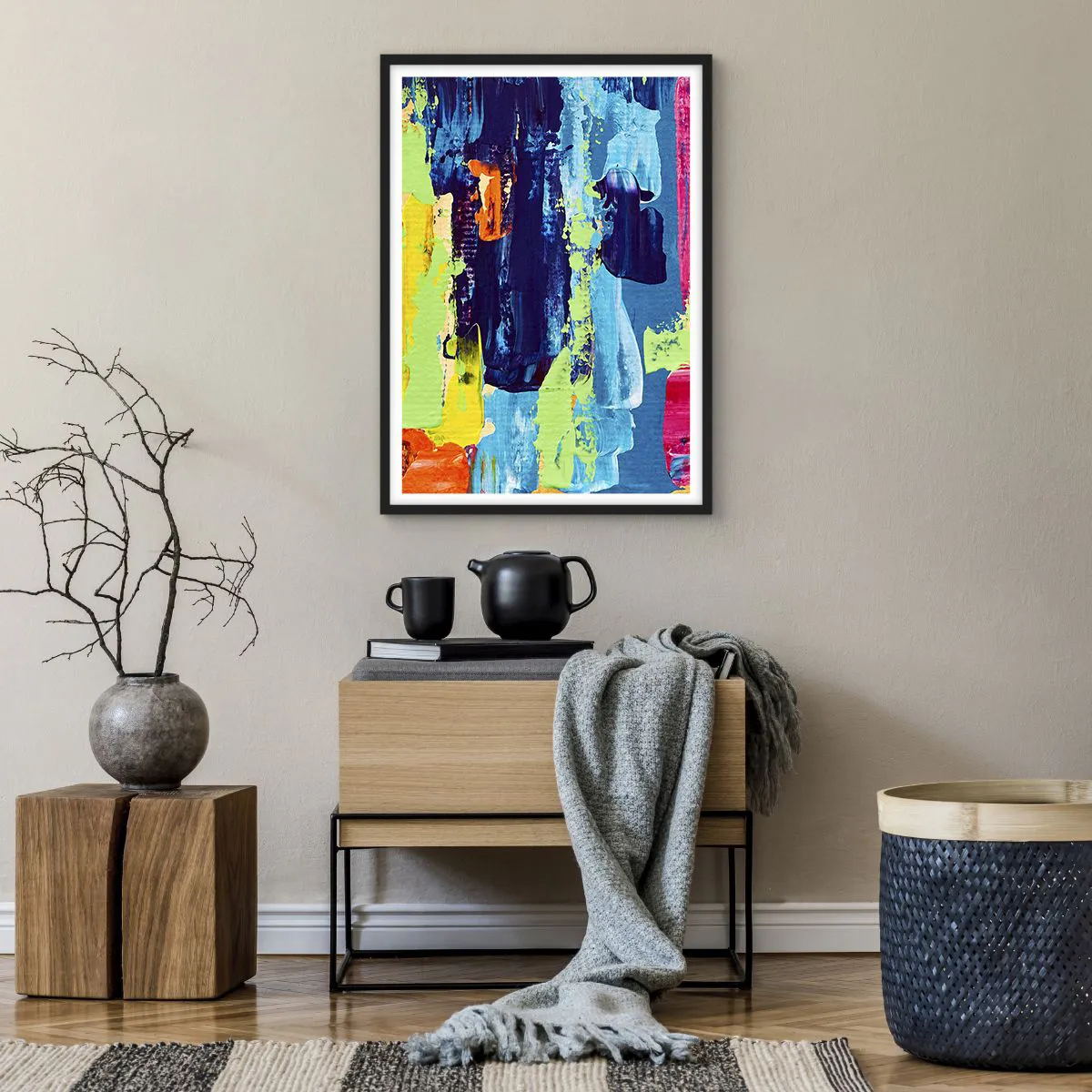 - Dieses Poster zeigt abstrakte Pinselstriche in leuchtenden Farben wie Blau, Gelb und Rot. Es passt perfekt in moderne Innenräume und verleiht ihnen Energie und Definition. Es wird mit einem eleganten schwarzen Rahmen geliefert.