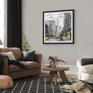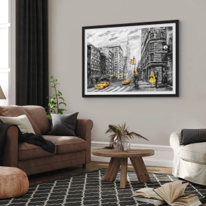 Poster in einem schwarzem Rahmen - Eine New Yorker Straße mit gelben Taxis im Hintergrund - 50x70cm - Eine New Yorker Geschichte - Moderne Wanddekoration für Wohnzimmer und Schlafzimmer ARTTOR