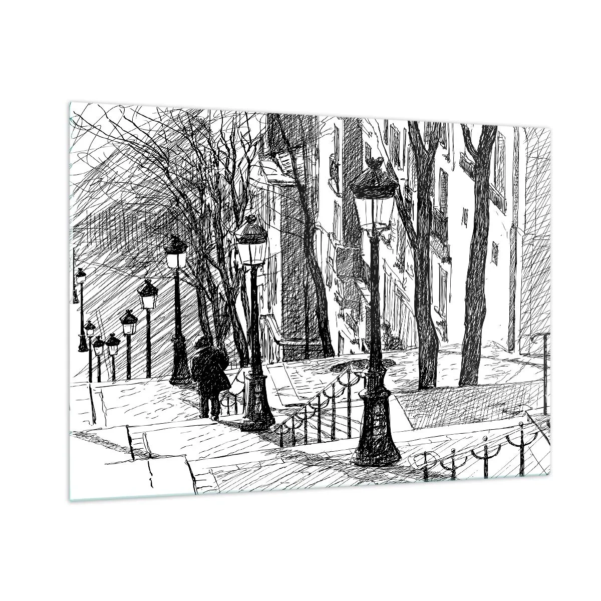 Glasbild - Bild auf glas - Schwarz-Weiß-Zeichnung einer Stadtstraße mit Laternen - 100x70cm - Liebesgeschichte oder Horrorgeschichte? - Moderne Wanddekoration für Wohnzimmer und Schlafzimmer ARTTOR
