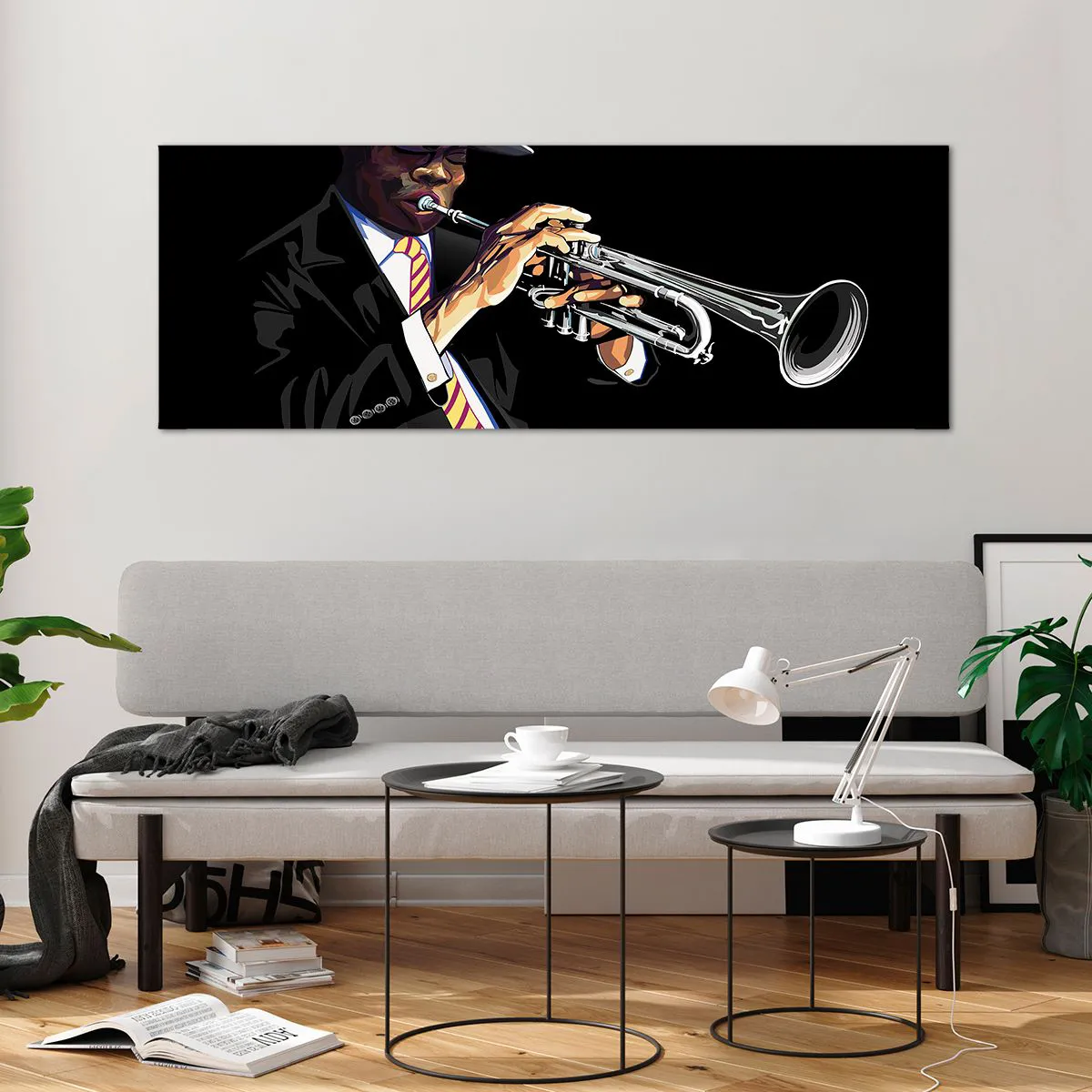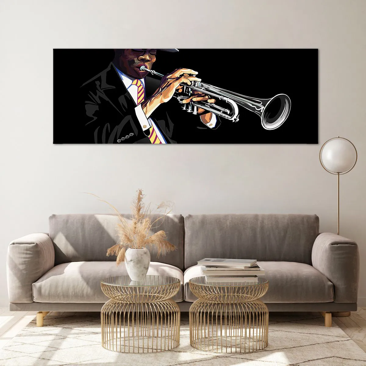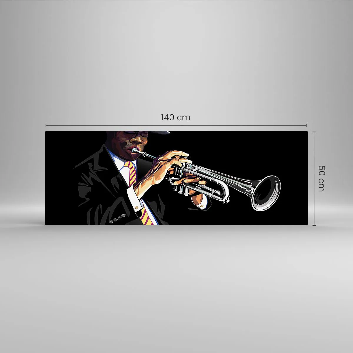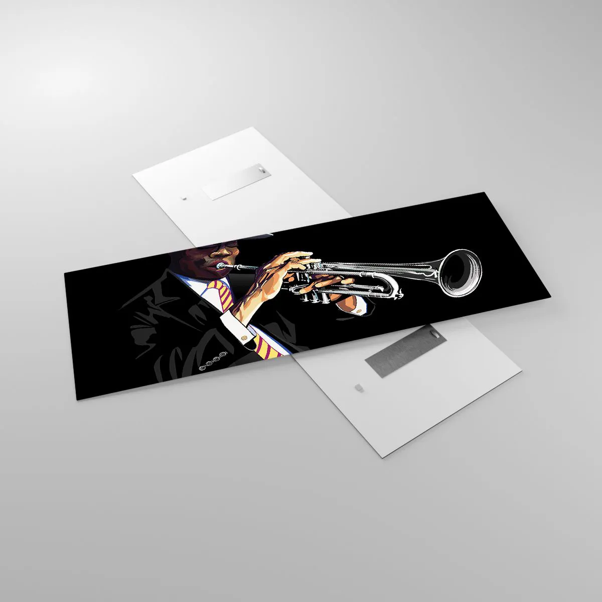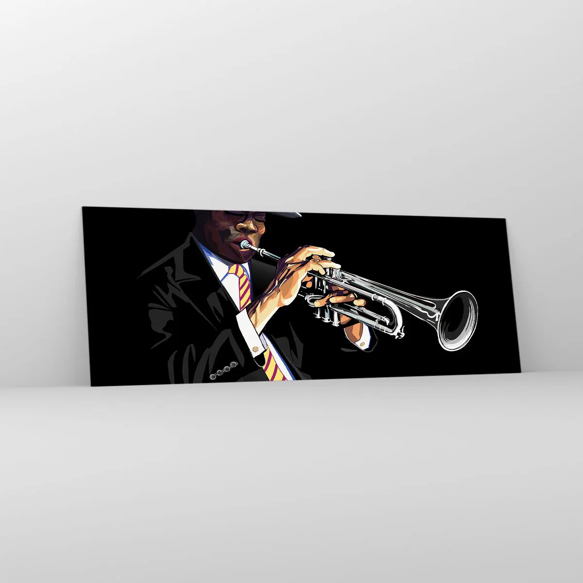 Glasbild - Bild auf glas - Ein Musiker spielt Trompete vor schwarzem Hintergrund - 140x50cm - Charme der alten Schule - Moderne Wanddekoration für Wohnzimmer und Schlafzimmer ARTTOR