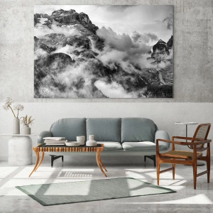 Diese Dekoration ist die perfekte Wahl für alle, die Minimalismus und die zeitlose Schönheit der Natur schätzen. Schwarz-weiße Berge mit Nebel sind ein Symbol für Frieden, Harmonie und raue Eleganz, die jedes Interieur bereichern und ihm einen einzigartigen Charakter verleihen.