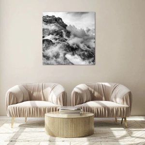 - Ein Glasgemälde, das monumentale Berge in Schwarzweiß darstellt, in deren Tälern Nebel hängt. Eine perfekte Dekoration, um Frieden und Harmonie zu bringen.