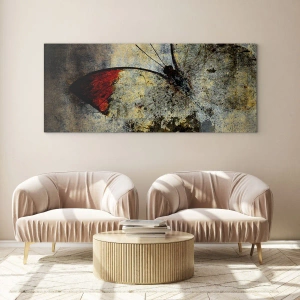 Glasbild - Bild auf glas - Ein Schmetterling in Rot- und Grautönen auf strukturiertem Hintergrund - 120x50cm - Pass auf, bevor ich verschwinde - Moderne Wanddekoration für Wohnzimmer und Schlafzimmer ARTTOR