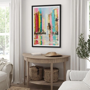 Poster in einem schwarzem Rahmen - Eine bunte Stadt und eine Frau in einem weißen Kleid mit einem Vogel - 70x50cm - Folge mir - Moderne Wanddekoration für Wohnzimmer und Schlafzimmer ARTTOR
