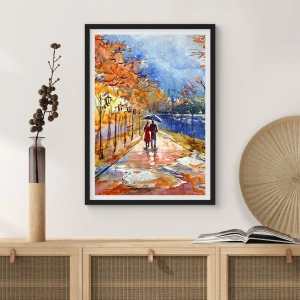 - Dieses Poster zeigt ein Paar, das im Regen unter einem Regenschirm spazieren geht, umgeben von herbstlichen Farben. Perfekt für romantische und elegante Innenräume. Das Produkt wird mit einem schwarzen Rahmen im Format 50x70 cm geliefert.