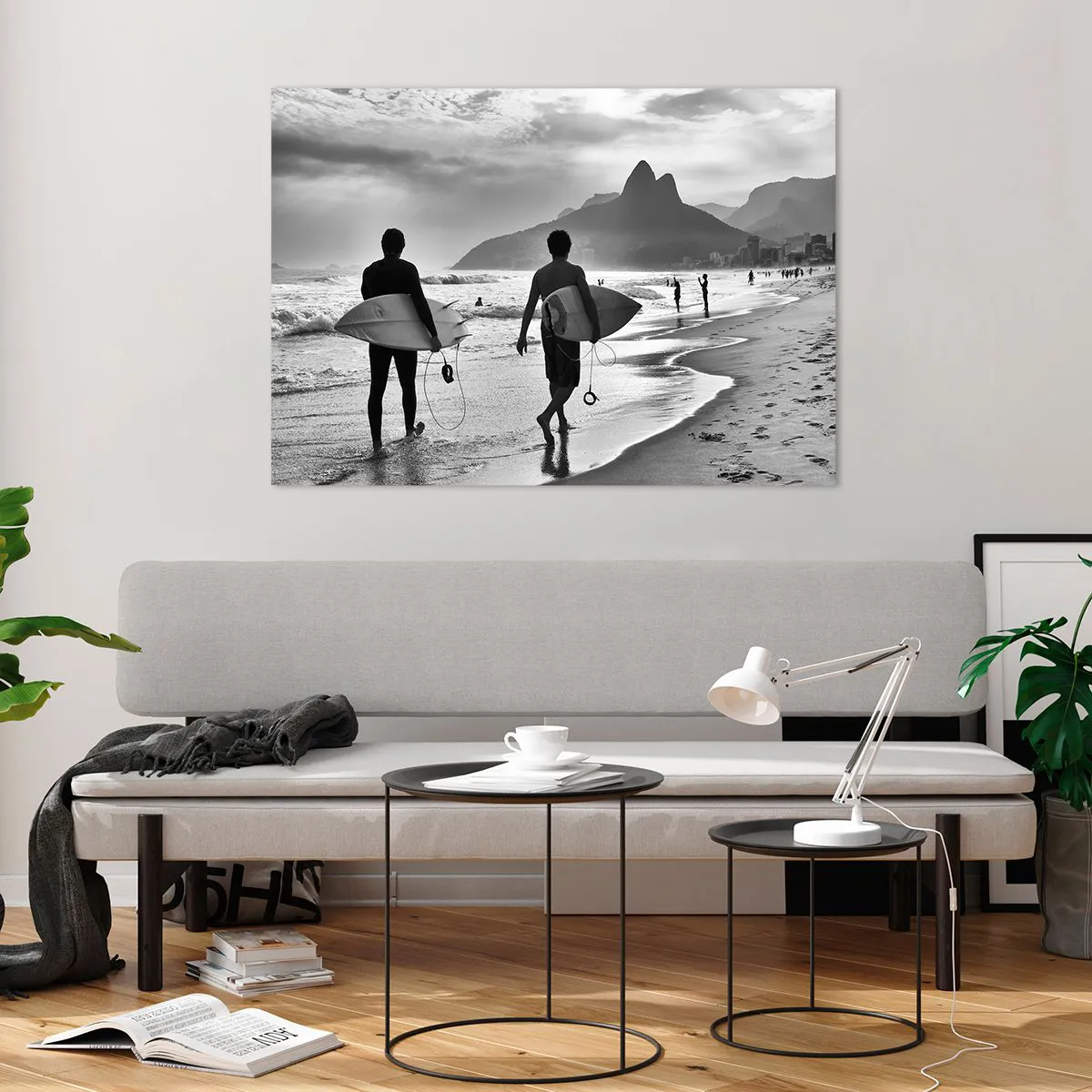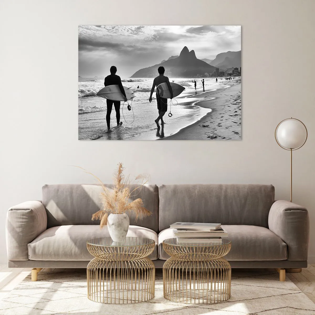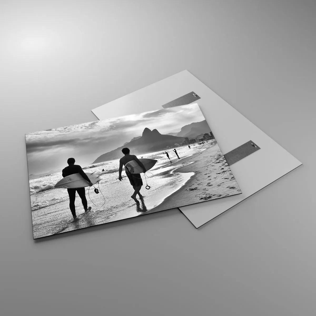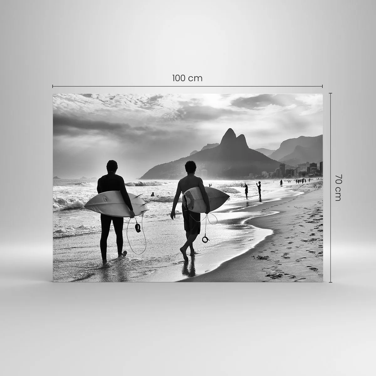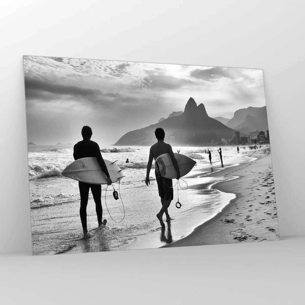 Glasbild - Bild auf glas - Surfer am Strand mit Brettern, Schwarz-Weiß-Komposition - 100x70cm - Single-Wave-Samba - Moderne Wanddekoration für Wohnzimmer und Schlafzimmer ARTTOR