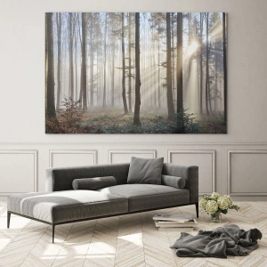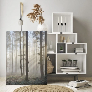 Glasbild - Bild auf glas - Ein Wald in leichtem Nebel mit Sonnenstrahlen, die durch die Bäume scheinen - 80x120cm - Der Nebel ist auch aufgewacht - Moderne Wanddekoration für Wohnzimmer und Schlafzimmer ARTTOR