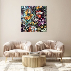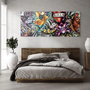 Glasbild - Bild auf glas - Eine farbenfrohe Komposition aus Mustern, inspiriert von der Tattoo-Kunst - 50x70cm - Der Traum des Tätowierers - Moderne Wanddekoration für Wohnzimmer und Schlafzimmer ARTTOR