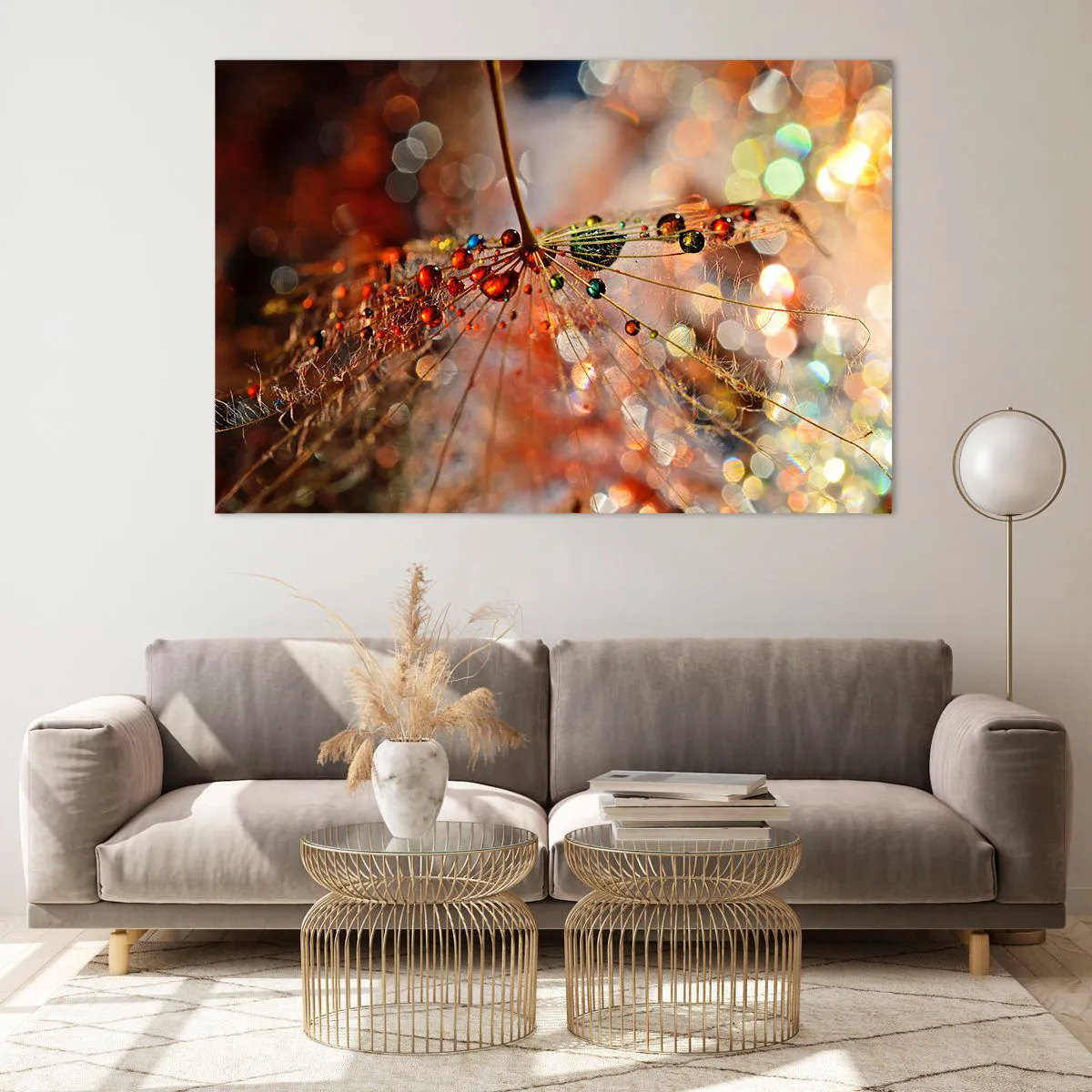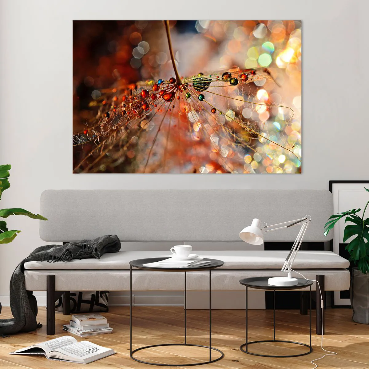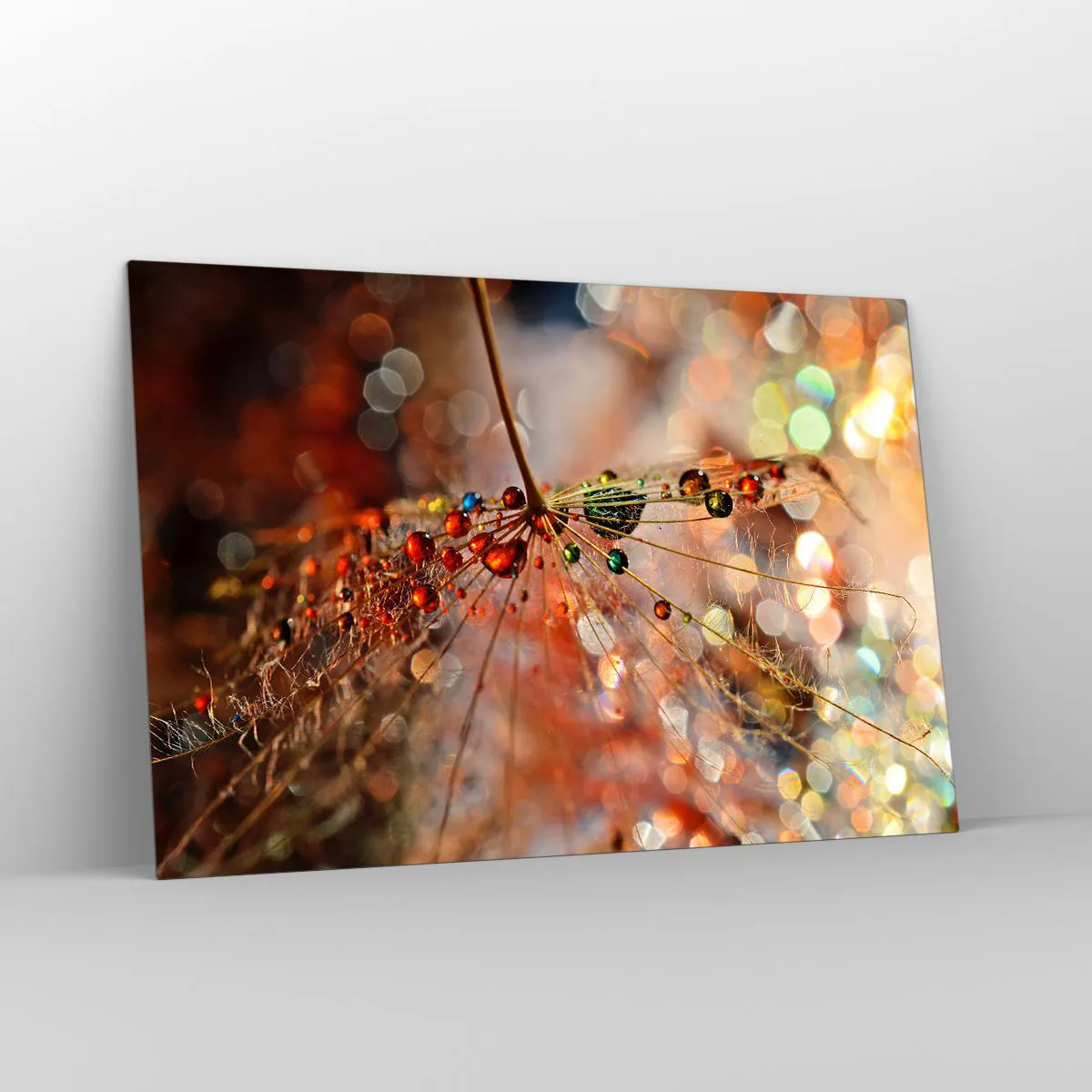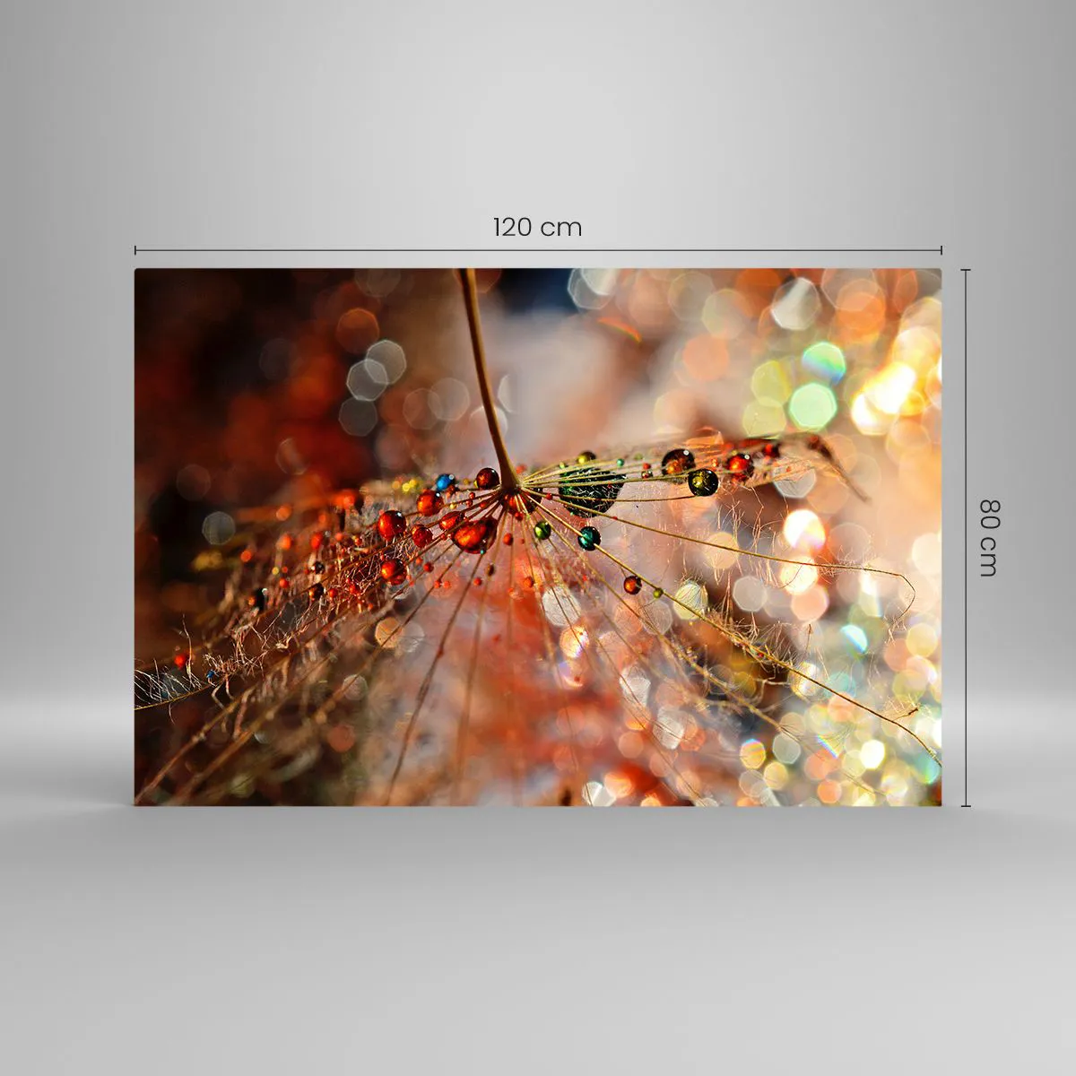 Glasbild - Bild auf glas - Wassertropfen auf einem zarten Spinnennetz im Bokeh-Licht - 120x80cm - Auf einem Spinnenfaden aufgefädelt - Moderne Wanddekoration für Wohnzimmer und Schlafzimmer ARTTOR