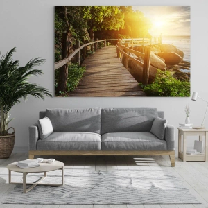 Glasbild - Bild auf glas - Eine Holzbrücke im Grünen, die in den Sonnenstrahlen zum Meer führt - 70x100cm - Noch eine Wendung, ein weiteres Wunder - Moderne Wanddekoration für Wohnzimmer und Schlafzimmer ARTTOR