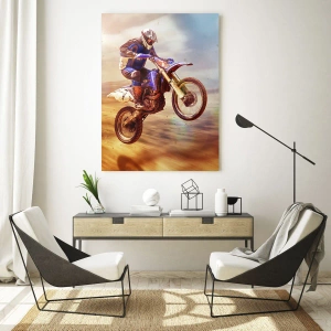 Glasbild - Bild auf glas - Ein Motorradfahrer fliegt über sandiges Gelände - 50x70cm - Motorradschwindel - Moderne Wanddekoration für Wohnzimmer und Schlafzimmer ARTTOR