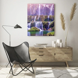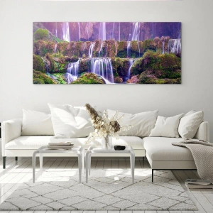 Glasbild - Bild auf glas - Wasserfälle umgeben von Grün mit pastellfarbener Beleuchtung - 160x50cm - Treppe zum Himmel - Moderne Wanddekoration für Wohnzimmer und Schlafzimmer ARTTOR