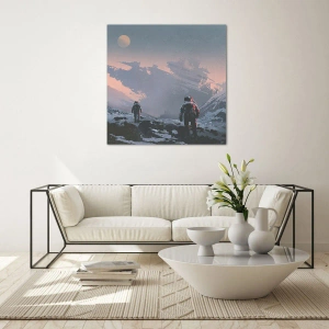 Tauchen Sie mit diesem außergewöhnlichen Glasgemälde in die faszinierende Welt der Science-Fiction ein. Die Szene zeigt Astronauten auf einem fremden Planeten, im Hintergrund ist ein Schiffswrack zu sehen, umgeben von majestätischen Bergen. Es ist eine außergewöhnliche Kombination aus Abenteuer, Mysterium und der Schönheit ferner Welten.