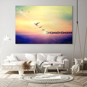 Glasbild - Bild auf glas - Vögel im Flug vor dem Hintergrund einer Kette und eines Sonnenuntergangs - 100x70cm - Der Sieg der Freiheit - Moderne Wanddekoration für Wohnzimmer und Schlafzimmer ARTTOR